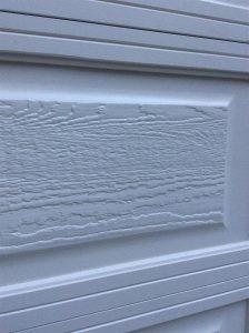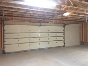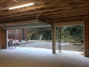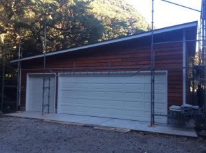 外壁はオリンピックマキシマム塗料 716Cedar Natural Tone と Outside White ガレージドアは木質パネルの上に半艶のウレタン塗装で仕上げています。