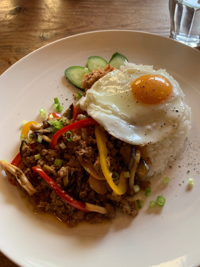 世界中のスパイスに魅せられたというオーナーシェフの創るアジアンテイストのメニューは、どれも食べてみたくて真剣に悩みましたが、ガパオライスと汁なし担々麺を頂きました。ランチのコースにはサラダやタイ風さつま揚げ(コレ、ほんとにスパイシーで美味しかった)、色々選べるドリンクとデザートも付いて満足度100%でした。