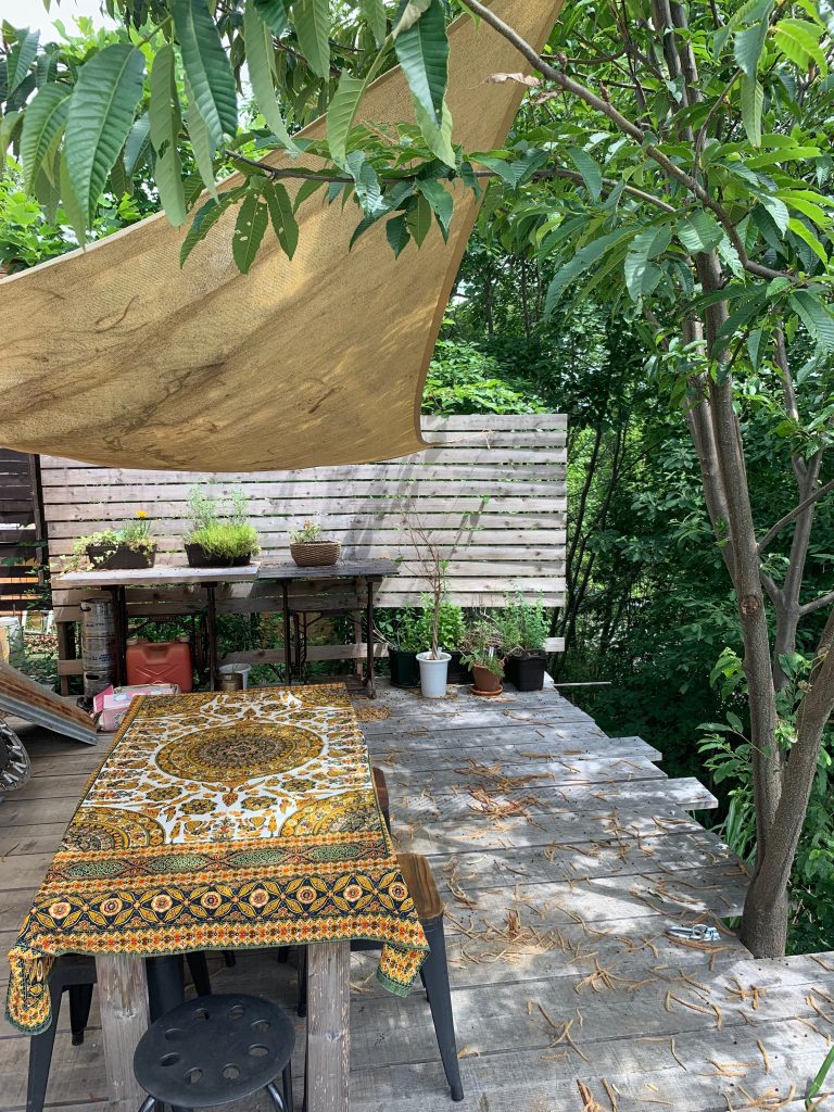 店内は天井が高く、大きなカウンターと木製のテーブルや椅子が並び、カウンターの奥の棚にはスパイスの入った瓶が整然と並んでいます。隅の方には薪ストーブも有りとてもいい雰囲気。店内からデッキに出ると、布製のタープと敷物が周りの緑とマッチして異国情緒を醸し出していました。