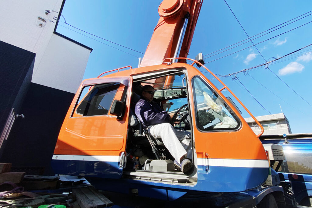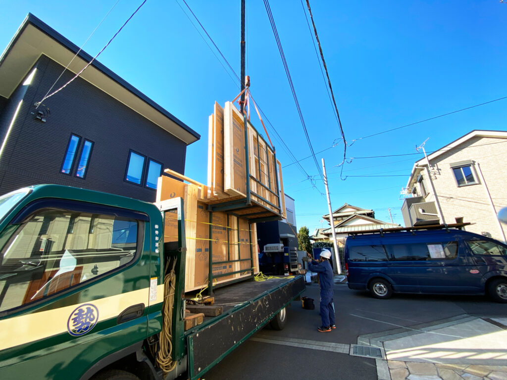 まずは、既にパネルになって運ばれてきた部材を現場に搬入します。こちらの現場は少し奥まった場所にあるので搬入が少し心配でしたが、クレーン屋さんの見事なクレーンさばきで次々と運ばれていきます。