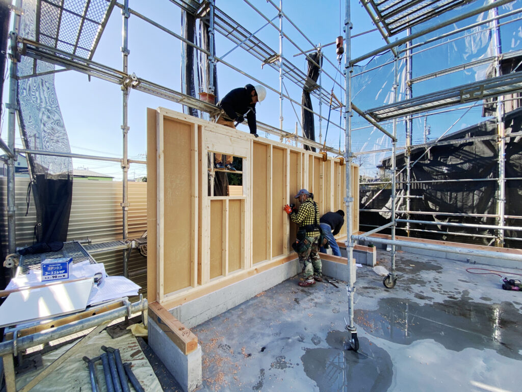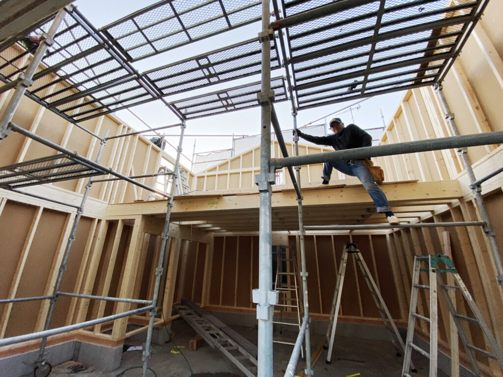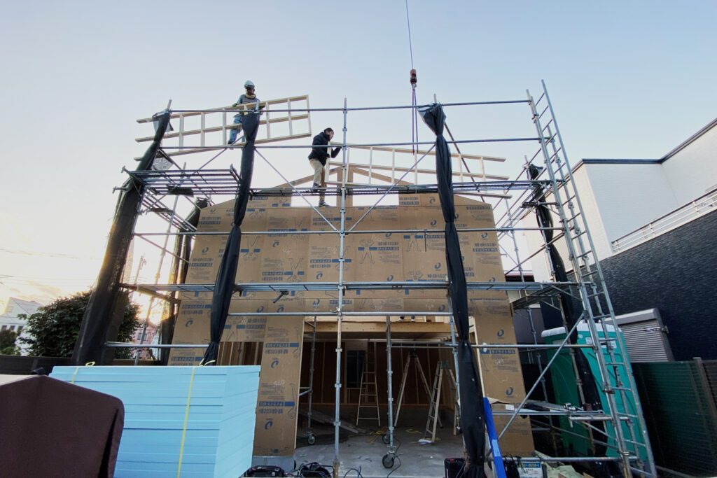 先日神奈川県の現場の建方がありました。工事の第一歩、構造材を搬入し組み立てる建方はツーバイフォー工法ならではのスピード感で進みます。当日は天気にも恵まれ、気持ちのいい快晴でした。