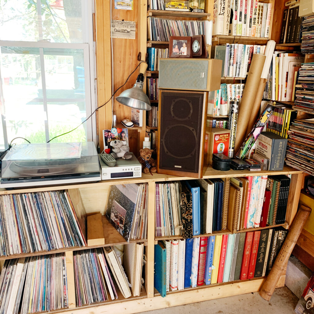 ガレージの中も見せていただきました。自転車、サーフボード、チェーンソー、オーディオ、レコード、本など様々なものが詰め込まれた秘密基地のようなガレージです。意識的にインテイリアを統一したりアクセントをつけたりせずに雑多に物が置いてあるにも関わらず、なんとなく洒落た居心地のいい空間が出来上がっており、オーナーのセンスの良さがとてもよく現れていました。