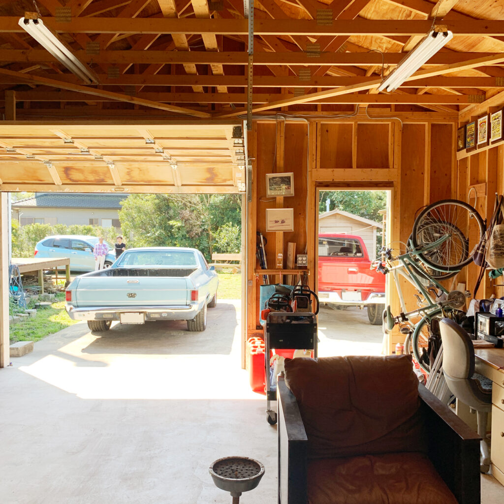 愛車はシボレー・エルカミーノ。鮮やかなブルーの車体がガレージの外壁の色にマッチしていていい雰囲気です。やはりシダーガレージ ✕ アメ車は王道の組み合わせだと改めて感じます。ザ・アメリカンガレージがお好みの方には是非参考にしていただきたいです。