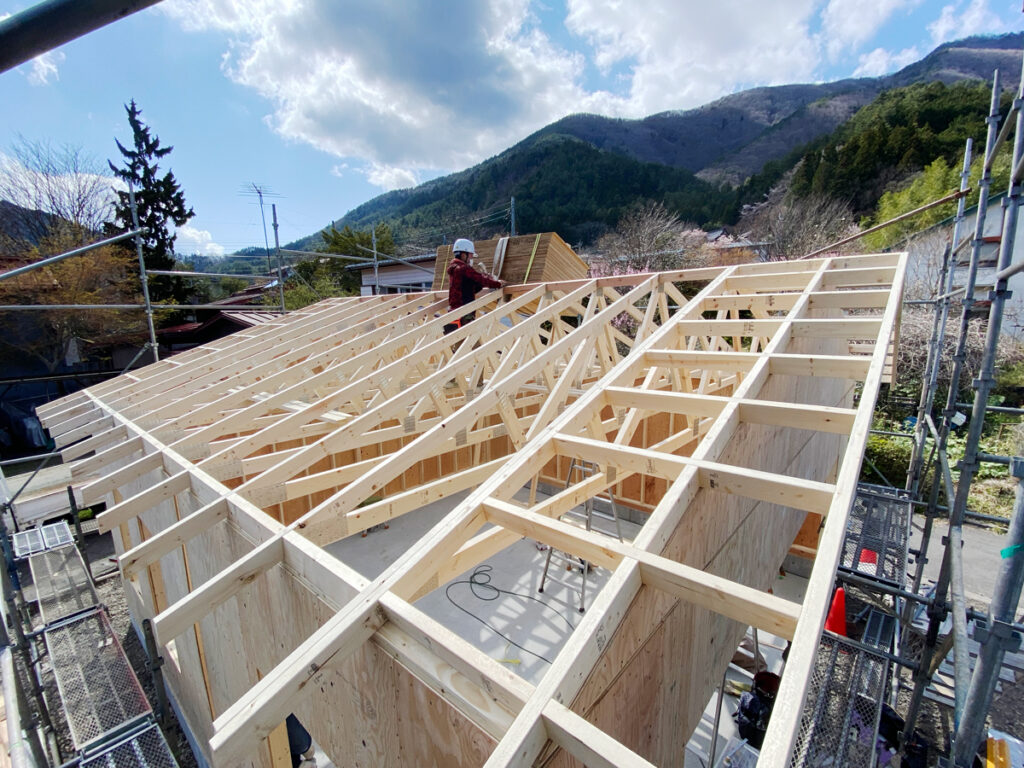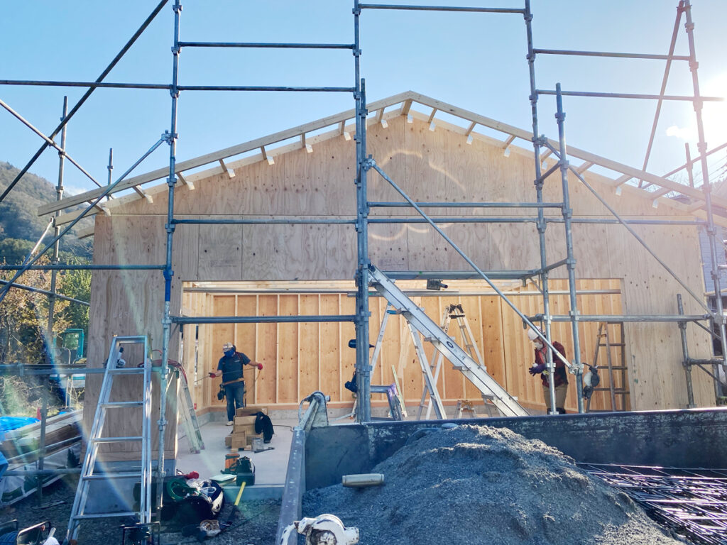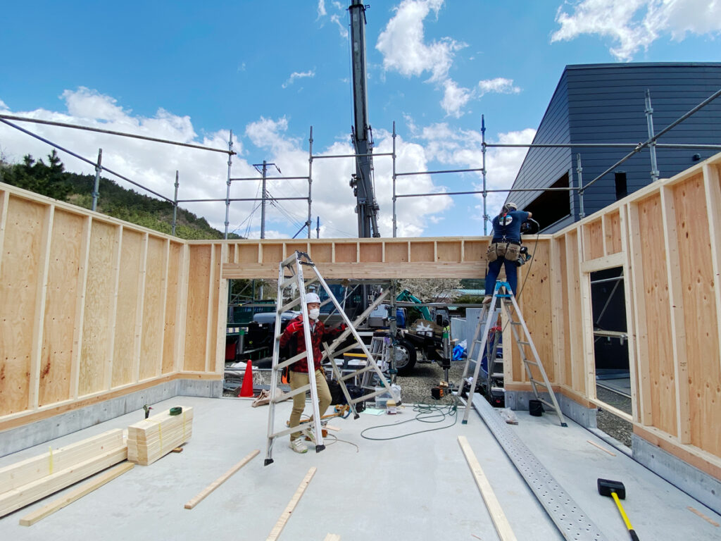 開始からおよそ2〜3時間で壁パネルの設置は完了です。次は小屋壁、ケラバ、トラスを設置していきます。