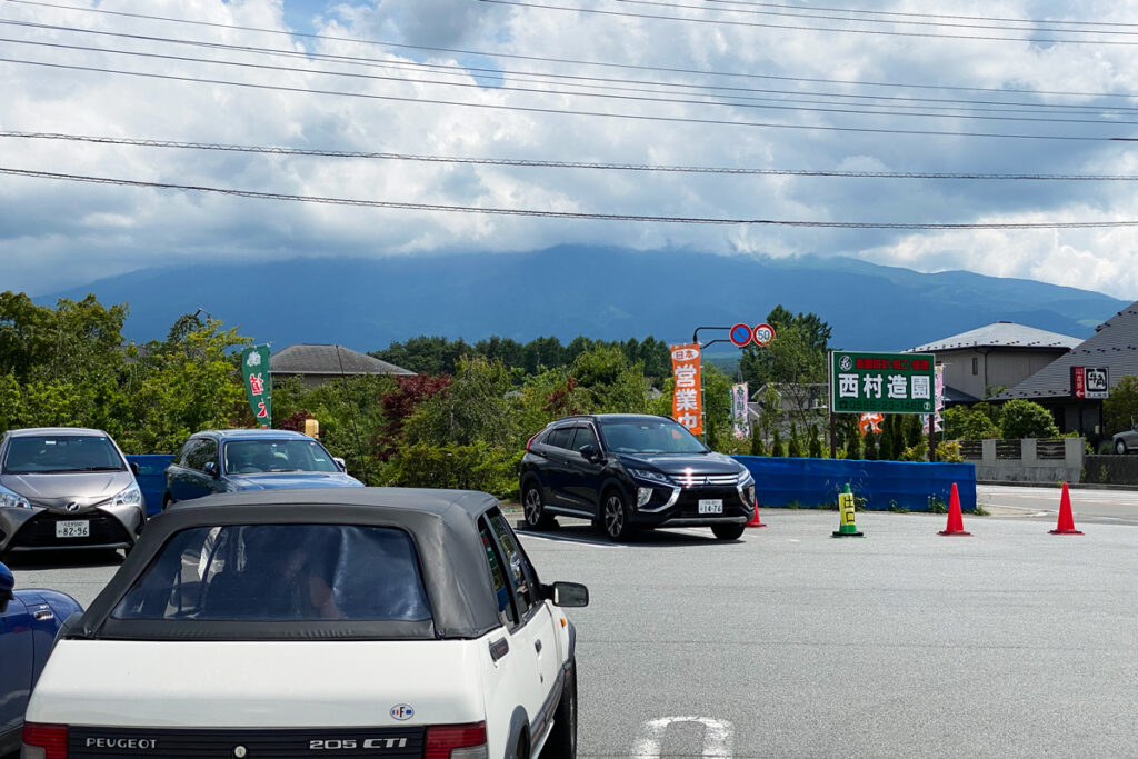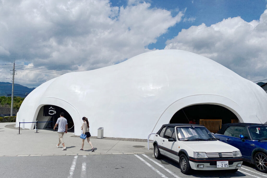 ちなみにこちらの[ほうとう不動・東恋路店]は、建築家の保坂猛さんによって設計された建物がとてもユニーク。沢山の人が外観の写真を撮っていました。私も帰りがけにパシャリ(車も)。