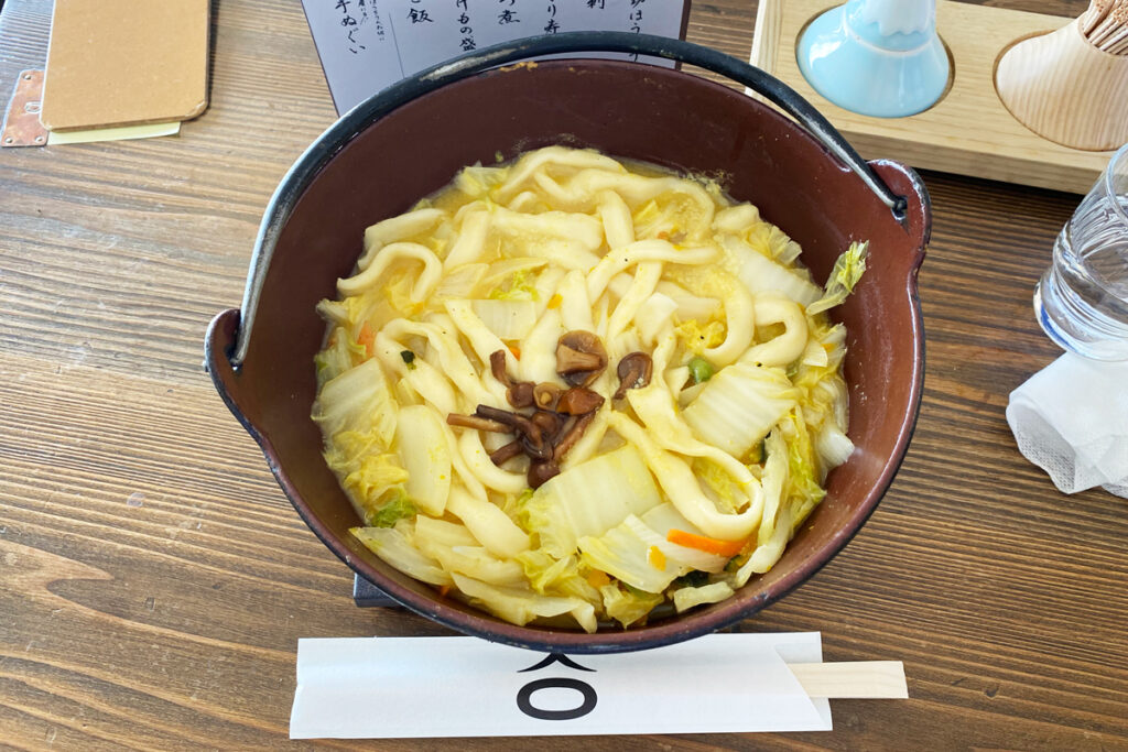 帰りは甲州名物のほうとうを。野菜と山菜がたっぷりです。