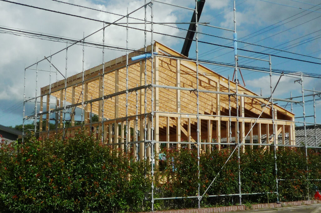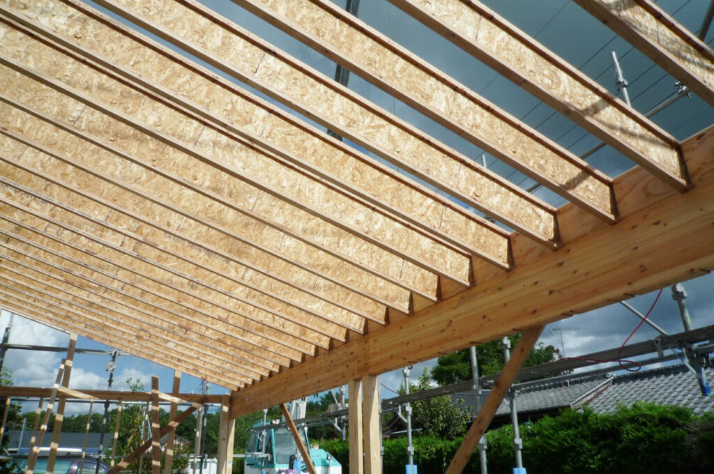 ジェイスタイルガレージのメイン商品である「シダーガレージ」は三角形の切妻屋根が一つの特徴ですが、以前「屋根に太陽光パネルを設置したいから片流れ屋根にしてほしい」というご要望を頂き、それに合わせてガレージを建てたことがあります。太陽光パネルに合わせた屋根勾配、建物の大きさ等の条件があり、ここでは普段使用するトラスではなくTJI®ジョイストという構造材を垂木として採用し屋根を組みました。