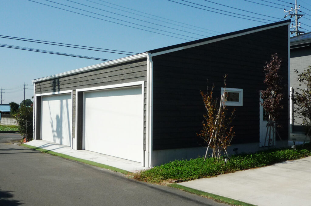 またこちらのガレージはシャッターを2つ並べて開口面積を大きく取るため、通常のツーバイ工法ではなく在来工法を採用しました。]