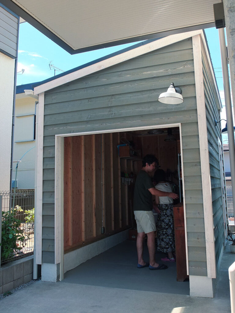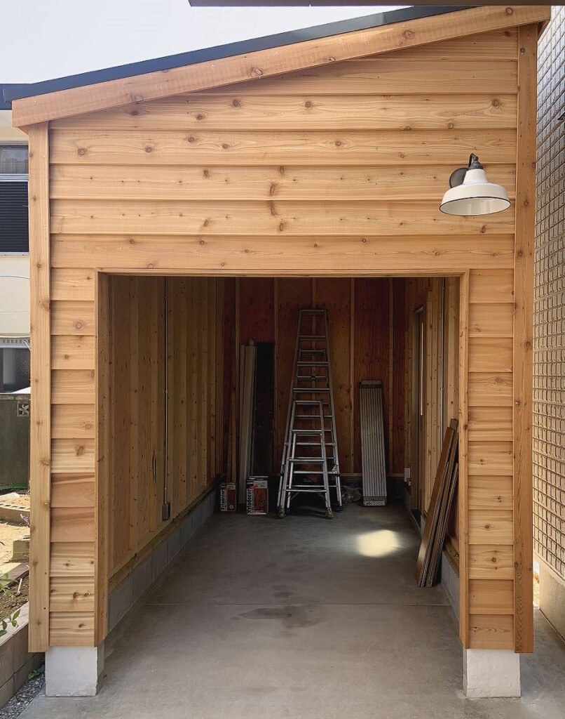 敷地の条件に合わせたオリジナルのバイクガレージ。これから木が経年変化して、味が出てくるのが楽しみです。