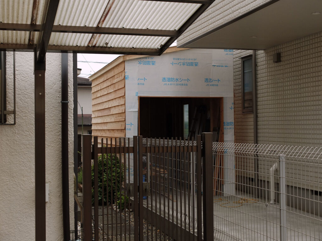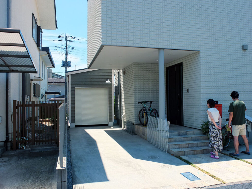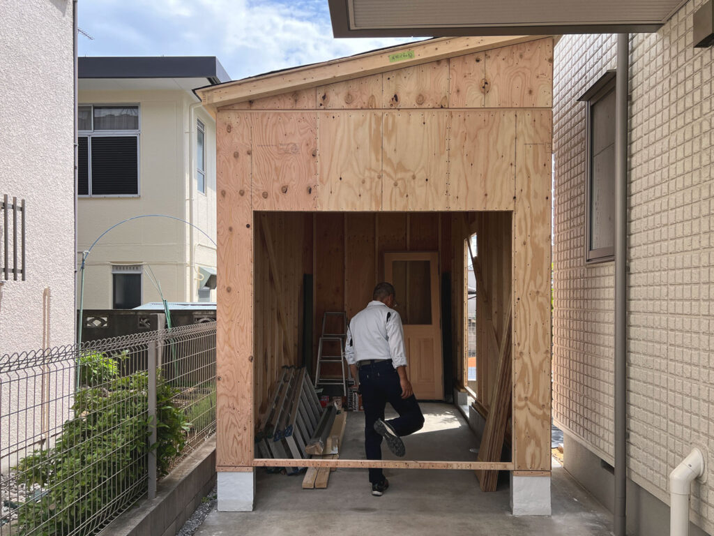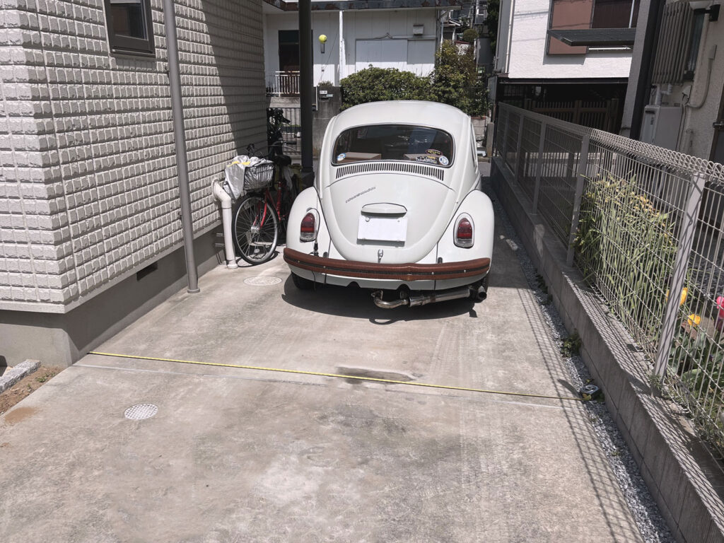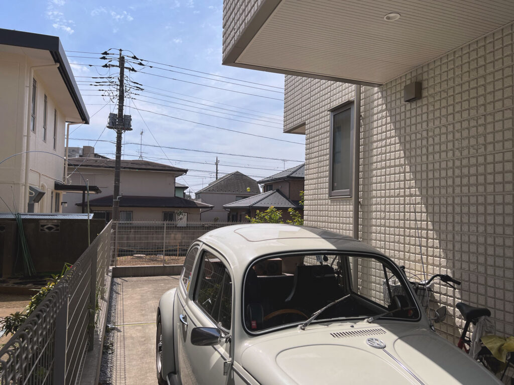 千葉県某所、住宅街の中にある今回の現場。少し前に建てられたご自宅の駐車場スペースに、愛車のバイクを格納したいというご依頼です。既製品だとご希望のサイズに合うものがないので、「シダーガレージ・ジュニア」をアレンジしてプランすることに。出来ればこのクラシックビートルも格納してあげたいところですが、建築スペースに限りがある為断念しました。