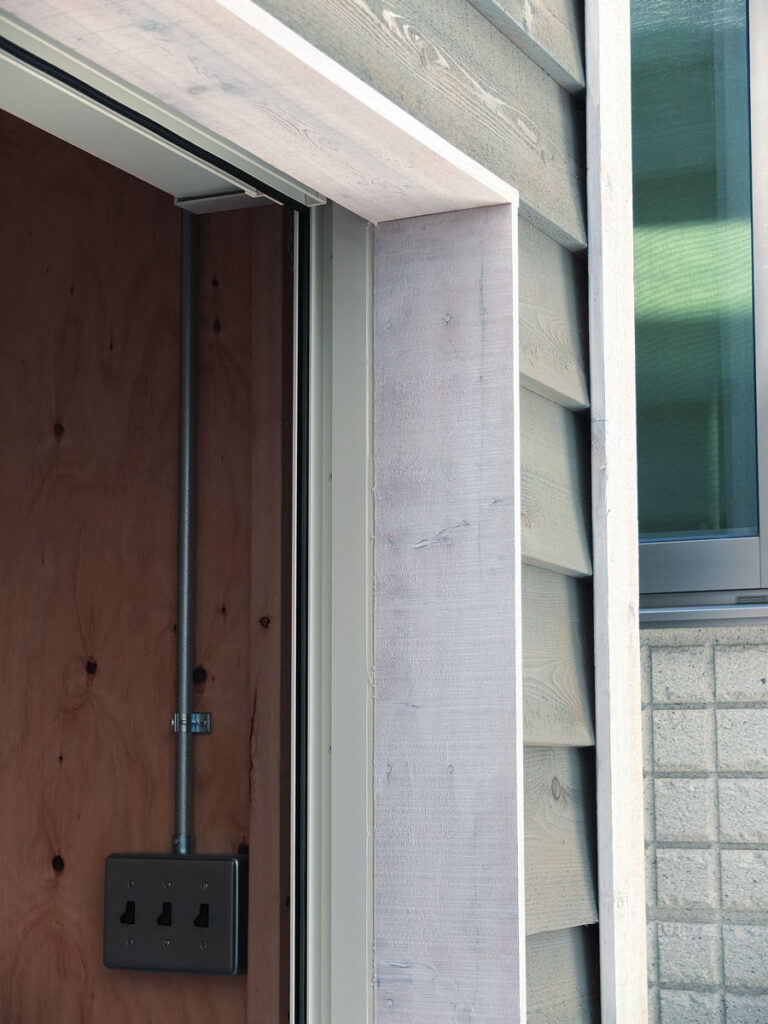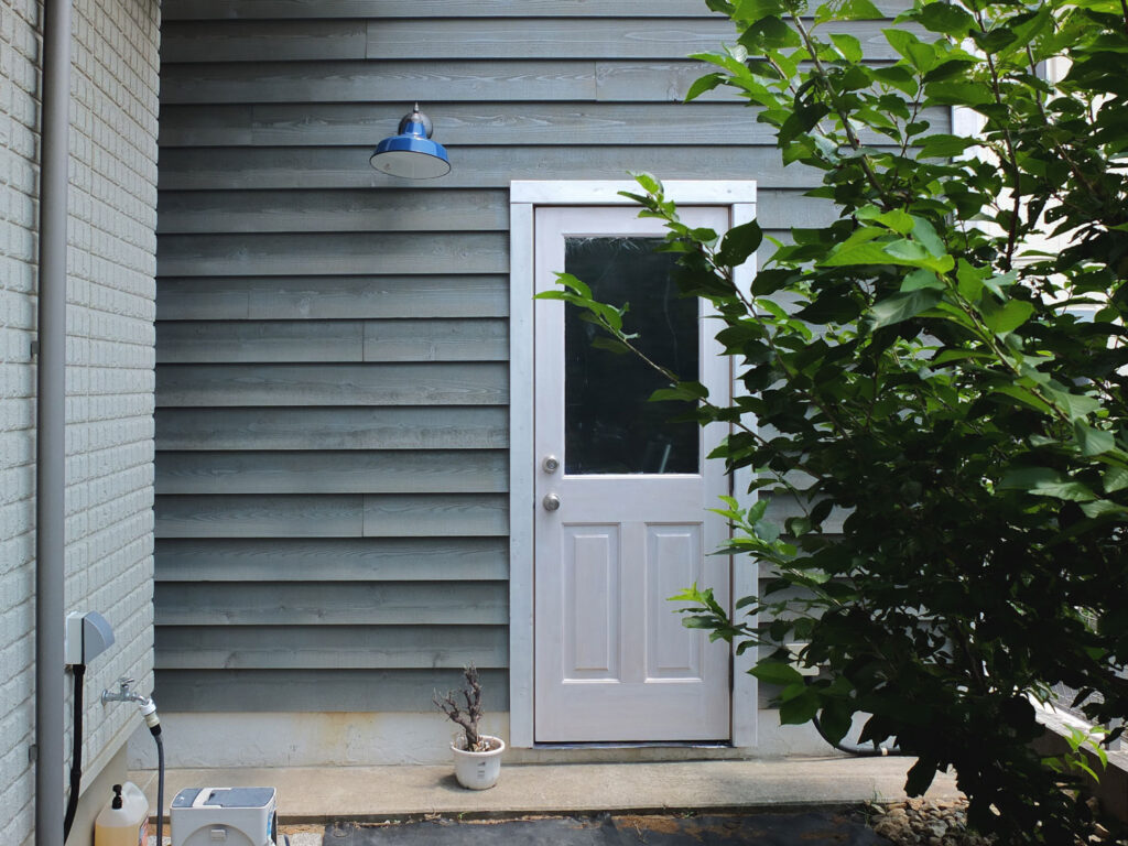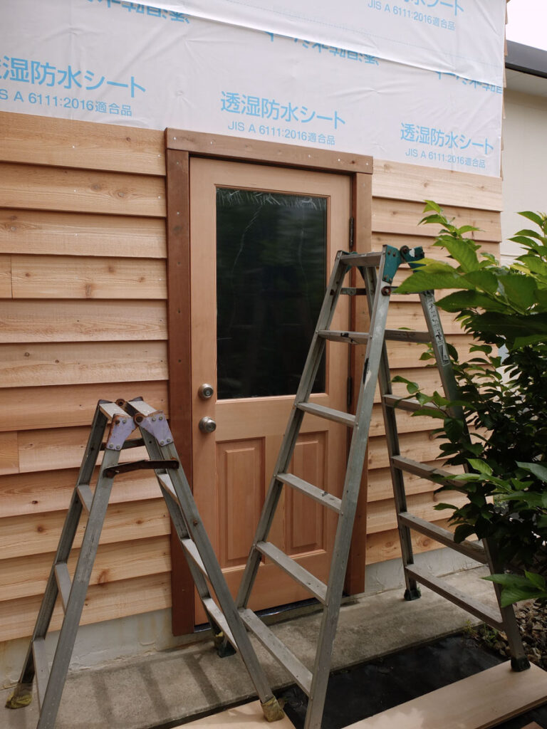 外壁はレッドシダーのベベルサイディング。ドアはシンプソンの窓付き木製ドアを採用し、木の雰囲気が存分に楽しめる仕様です。