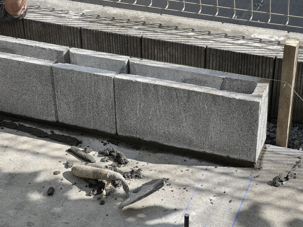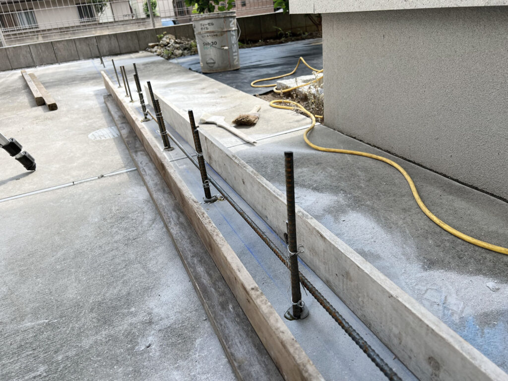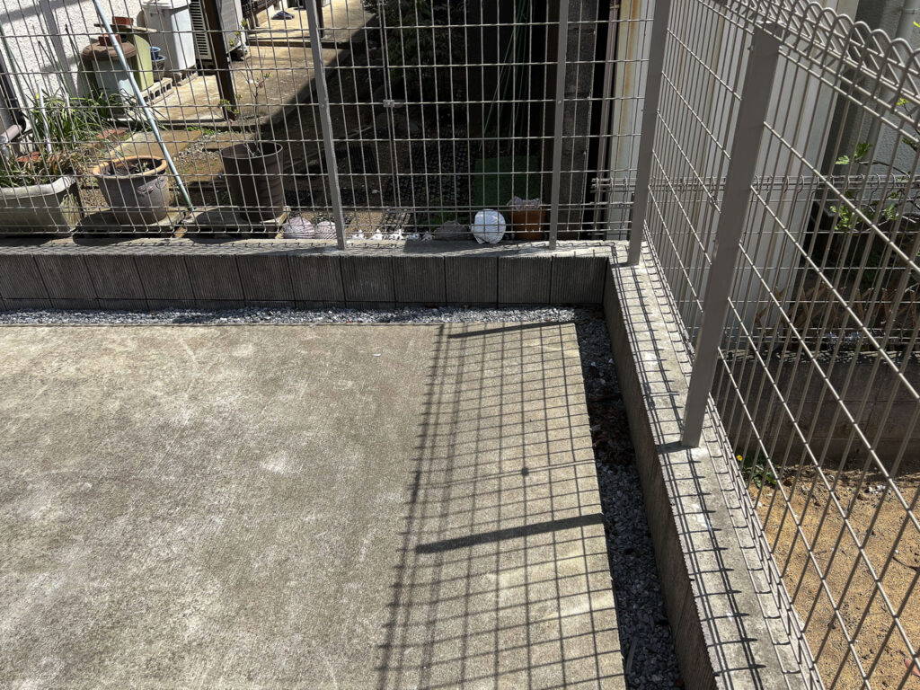 工事開始です。既存の土間コンクリートは活かし、その上にブロック基礎を設置します。梅雨の時期の施工でしたが、晴れが続いてラッキーでした。