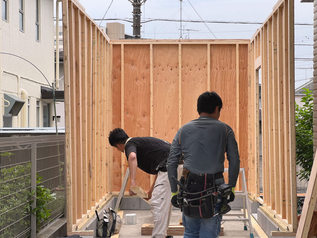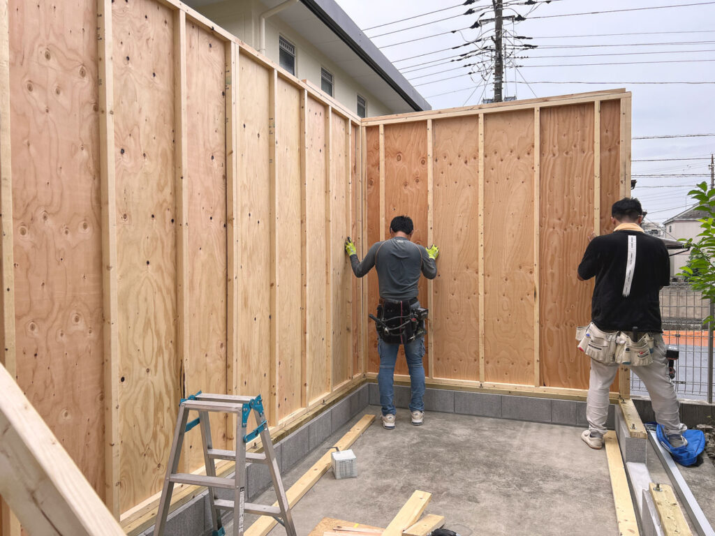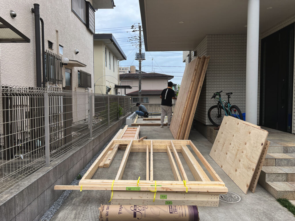 後日、構造材が納品されました。「シダーガレージ・ジュニア」はツーバイフォー材の半割材をスタッドにした軽量の壁パネルなので、大人二人で持ち上げて移動できます。また屋根構造もパネルになっているので、それぞれの壁パネルを順番にビスで固定していくだけ。