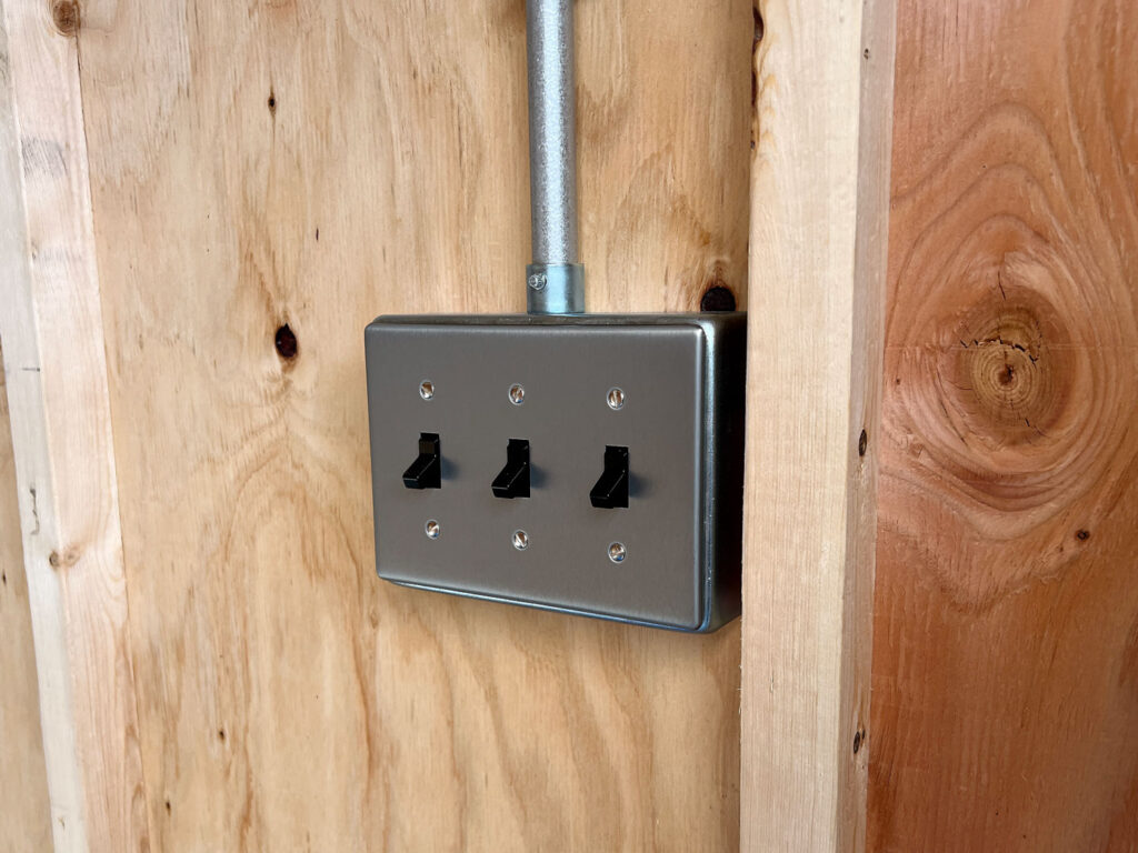 内装はせず、構造現しです。鉄管パイプを這わせて、中に配線を通します。コンセントやスイッチは金属製を採用しインダストリアルな雰囲気で統一。