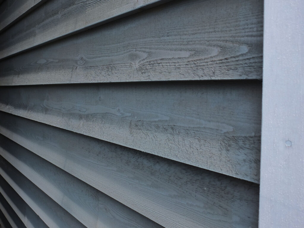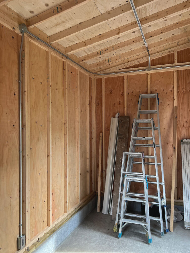 完成したバイクガレージがこちら。オーバースライダータイプのガレージドアはレールが屋内に伸びて空間を遮ってしまうので今回は電動の巻き上げシャッターを採用しました。外壁はオーナーのご希望でブルーグレーに塗装。半透明タイプなので木の雰囲気を損ないません。
