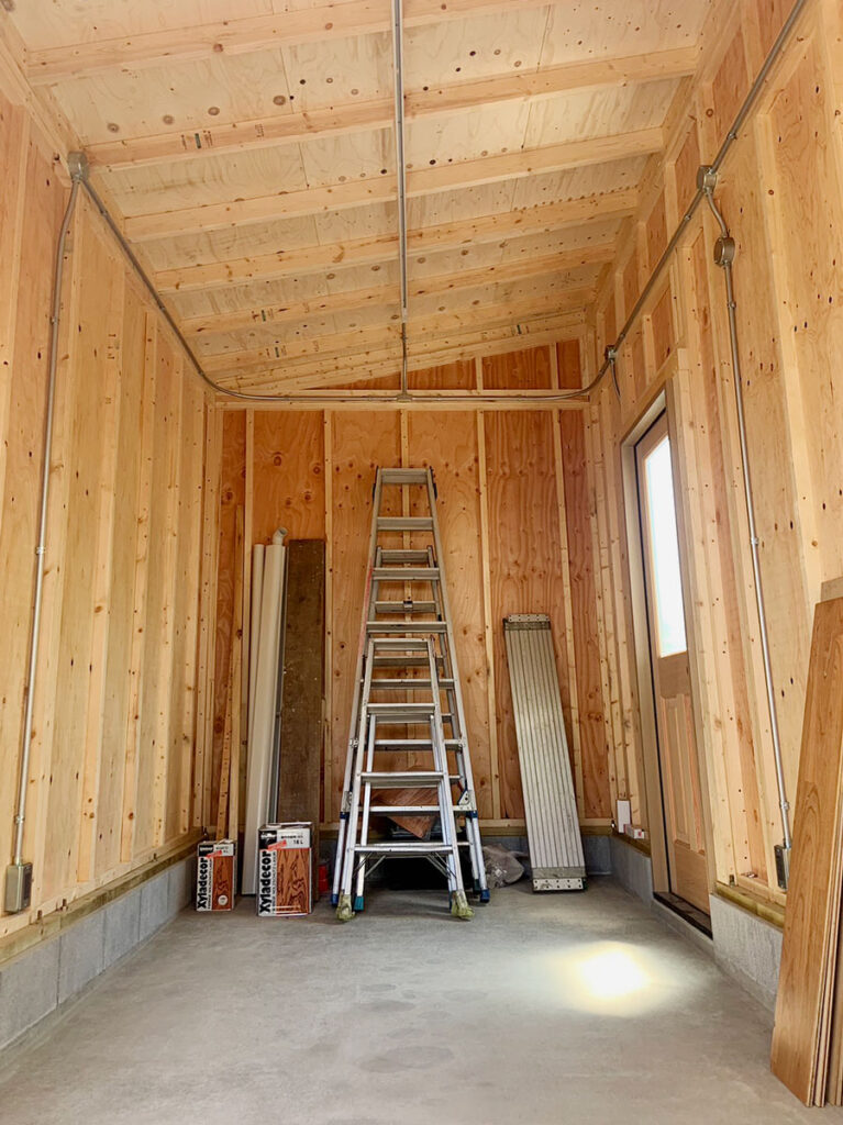 数時間で構造工事は完了です。建ってみると中は広く、頭上空間もかなり余裕があるので開放的です。
