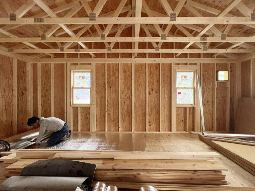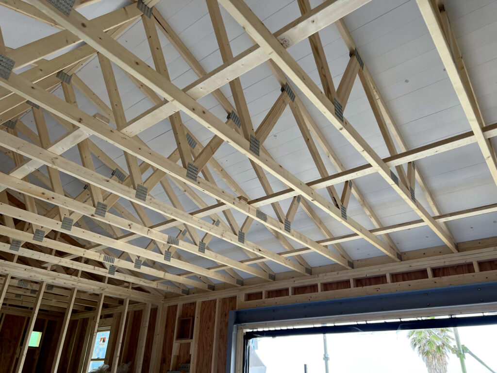 屋内はシダーガレージの特徴であるギャングネイルトラスが並びます。一般的な住宅の場合ですと、トラスの下端に天井を張りますが、今回は屋根断熱の工法をとっているため天井は張らずあえてトラスが見える状態での仕上げとなります。