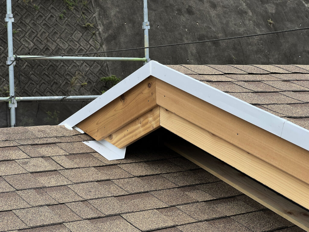 建物の幅が途中で変わるので、屋根の棟が二つになっているのですが、切妻屋根が重なる様子が外観上の一つのアクセントとなっています。また今回は、野地板を二層にして断熱材をサンドイッチする屋根断熱工法を採用しており、通常用より屋根の厚みがあるのでレッドシダーの破風・はな隠しを二重張りしているのですが、重厚感があってとてもいい雰囲気です。