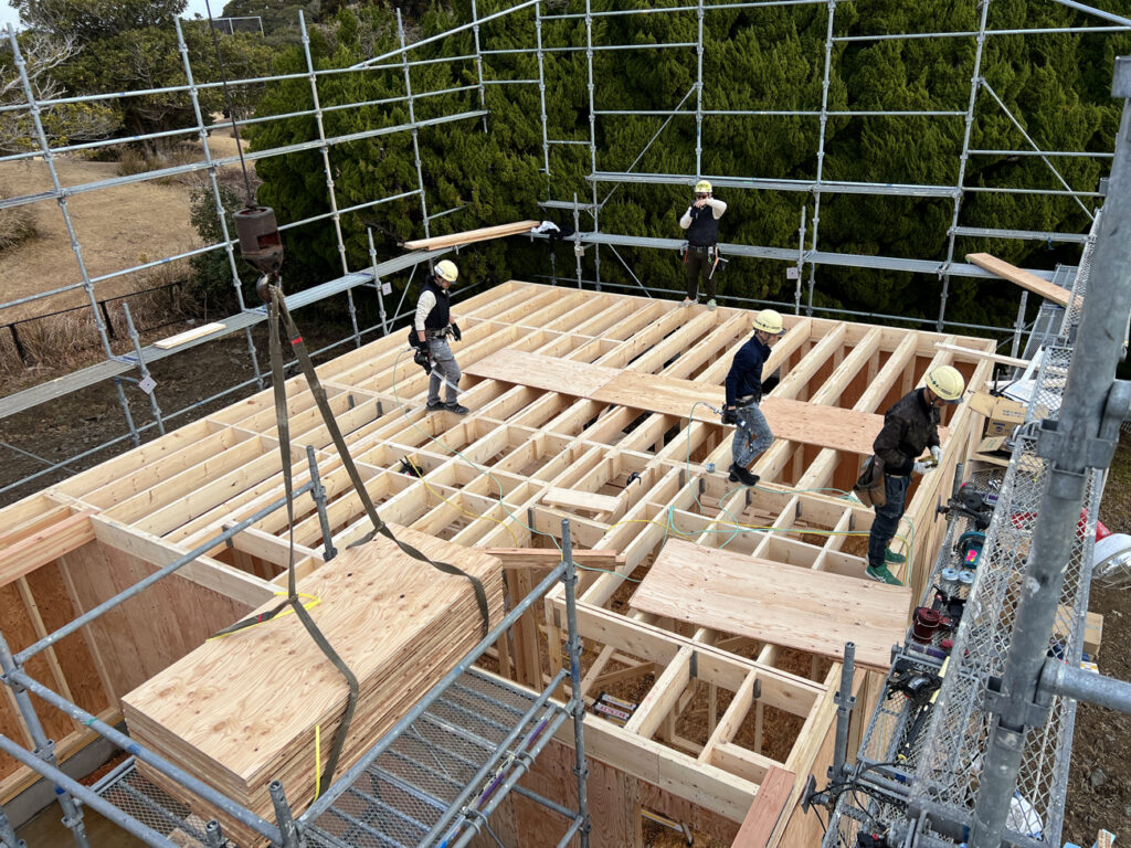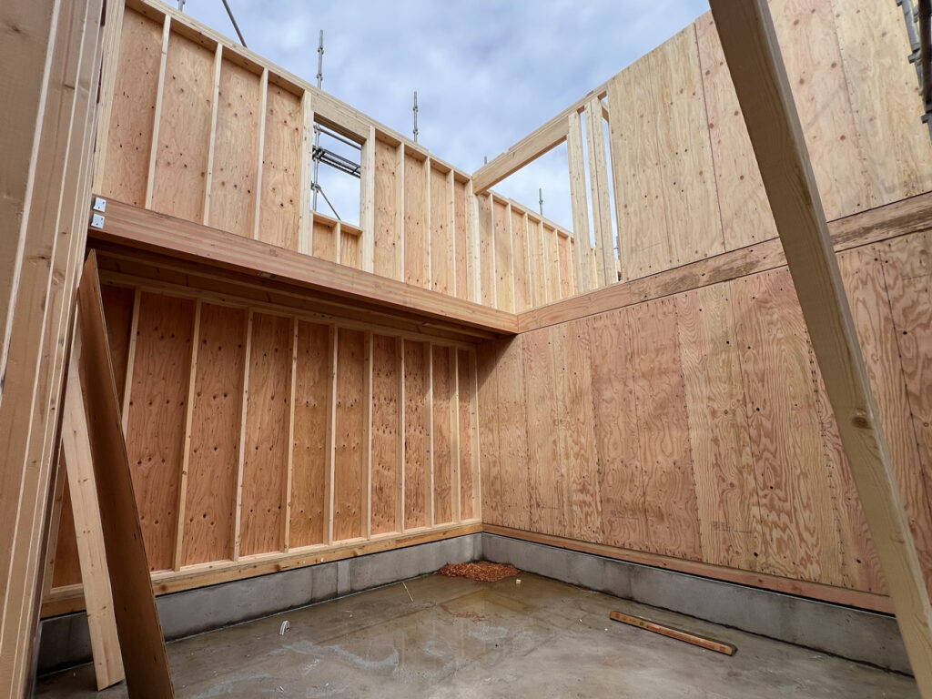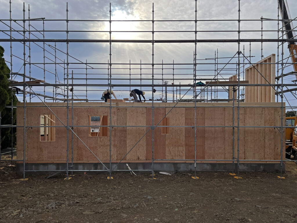 基礎工事が完了すると、いよいよ建て方工事(上棟)です。ツーバイ専門のフレーミングチームに来てもらい、スピーディに工事が進みます。建て方で2日半、防水紙と胴縁の取り付けで1日半の合計4日で工事完了です。