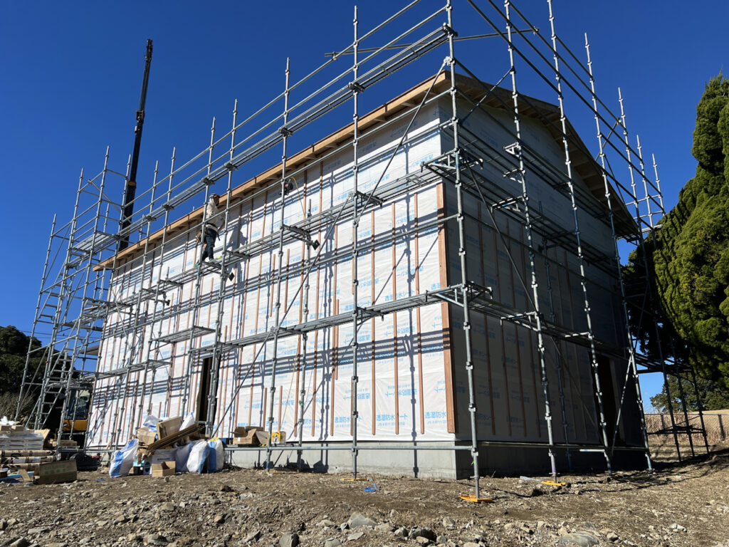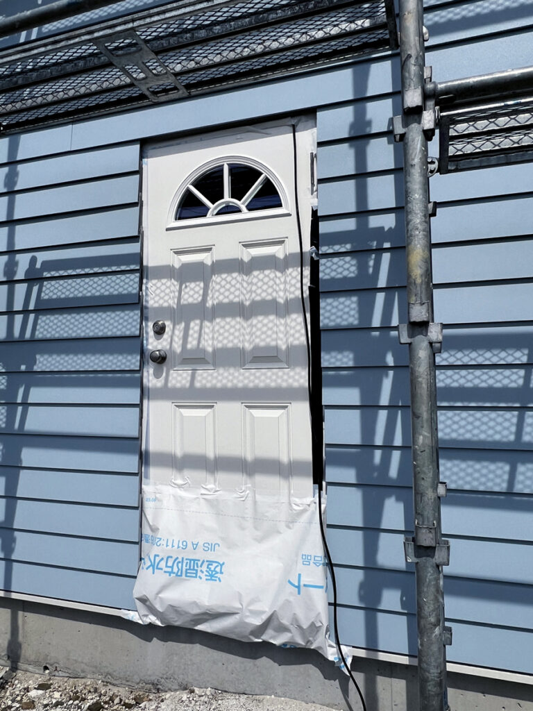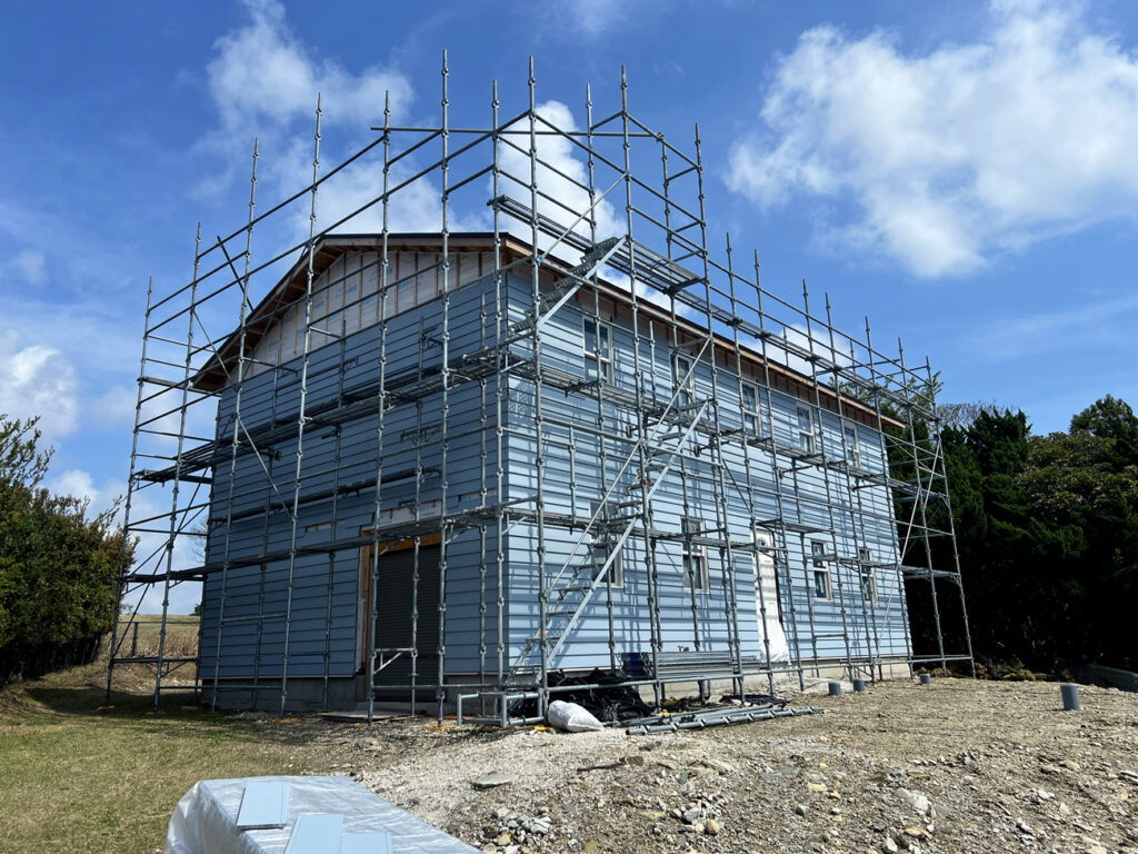 後日。現場の近くに行く用事があったので立ち寄ってみると、着々と進んでいました。残念ながらこの日は施主様にはお会いできませんでしたが、実際見てみると「本当に自分でやっているんだ」と感動を覚えます。青い空にブルーのサイディングが映えています。