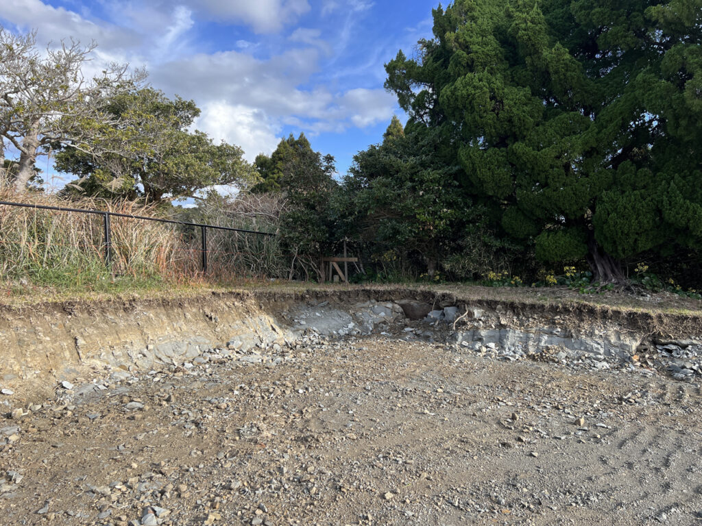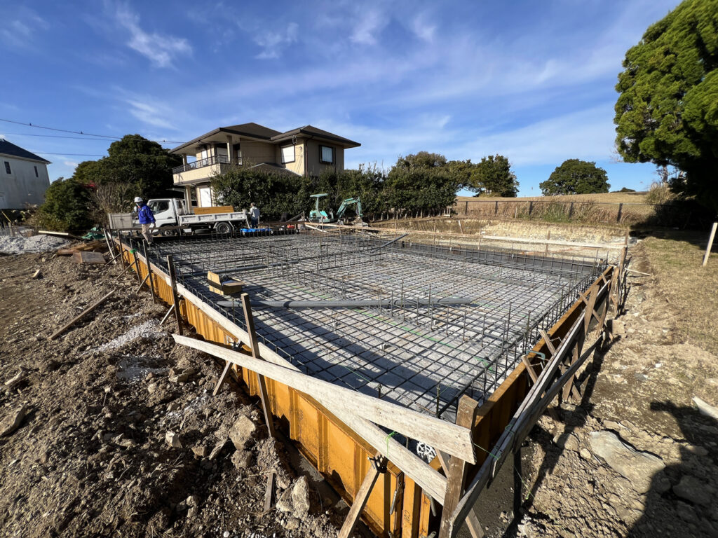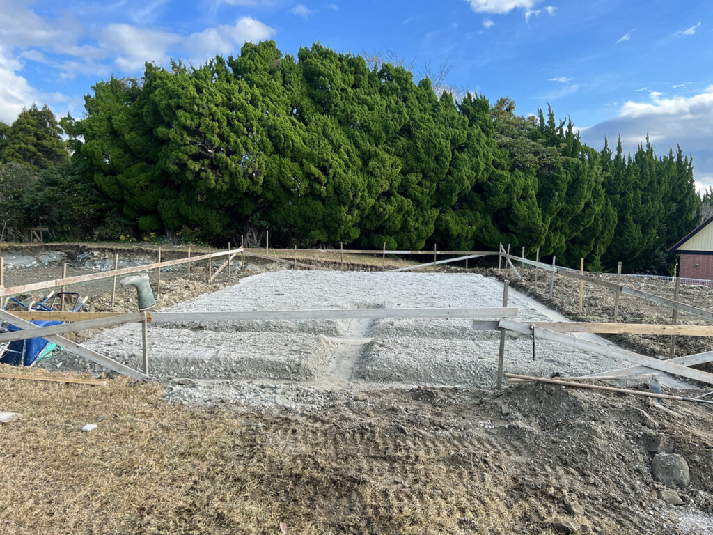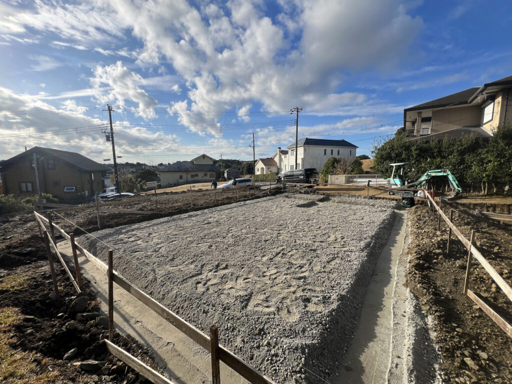 確認申請が済み、工事開始です。まず初めに傾斜している地面を掘り、フラットな地面をつくったのですが、こちらの土地は地盤が岩盤で硬く、基礎屋さん曰く「掘るのがめちゃくちゃ大変」だったそうです。確かに掘った場所を見ると、割と大きい岩がゴロゴロと転がっております。