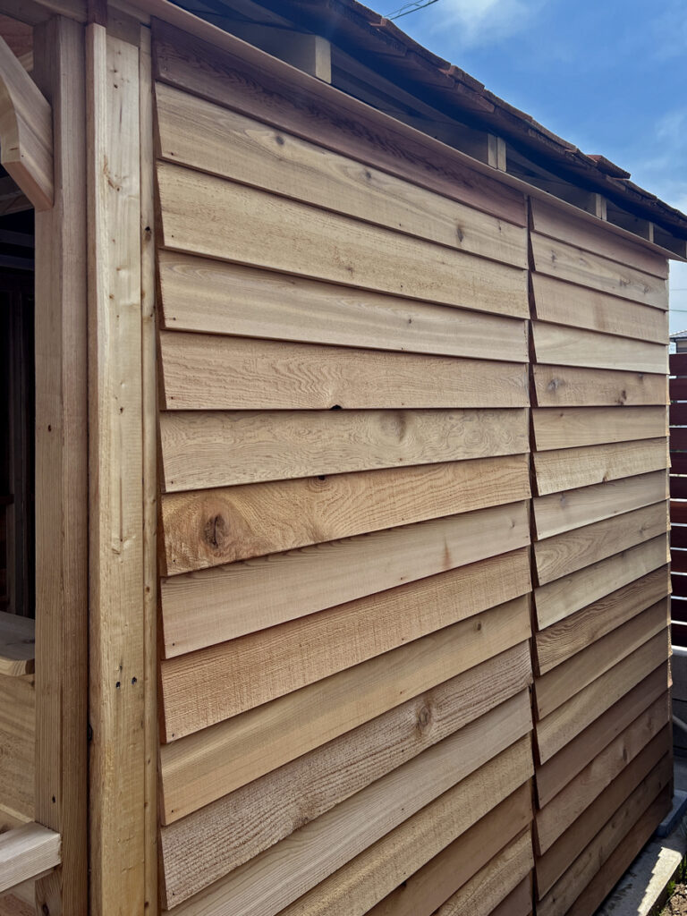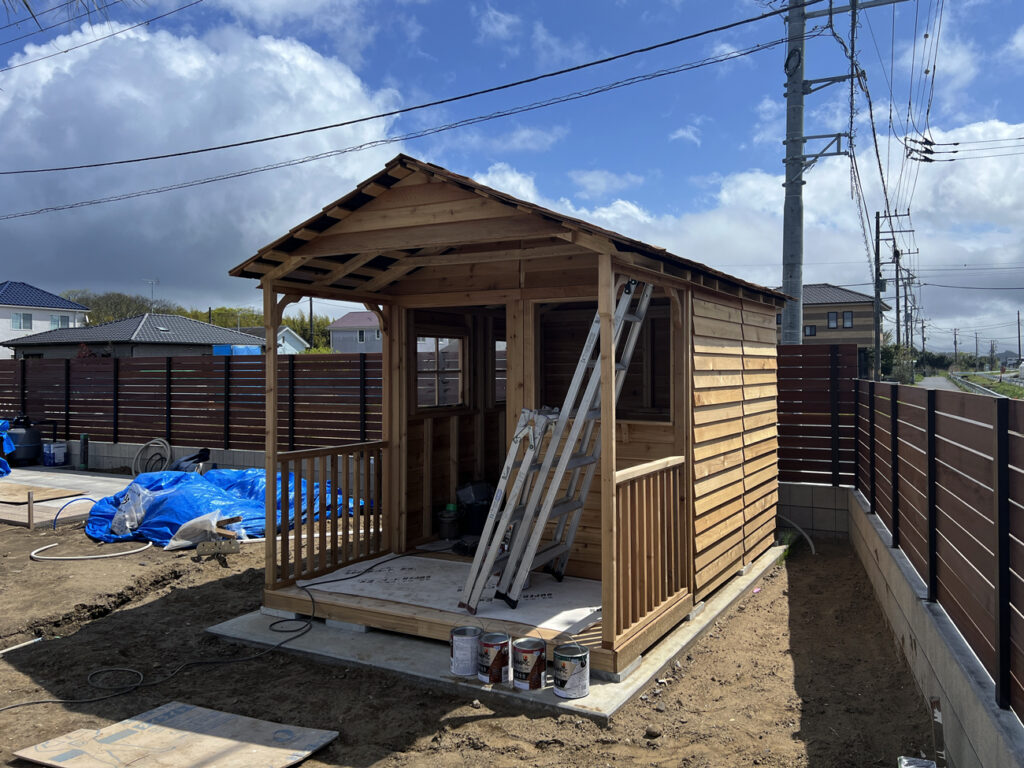 おおかた組み立てが完了した姿です。パネルになっているので、一日でこの姿まで仕上がることが出来ました。外壁はナチュラル色、ドアパネルや破風はな隠しのトリム部分はホワイトに塗装するのですが、ホワイトの部分は塗ってから取り付けることに。