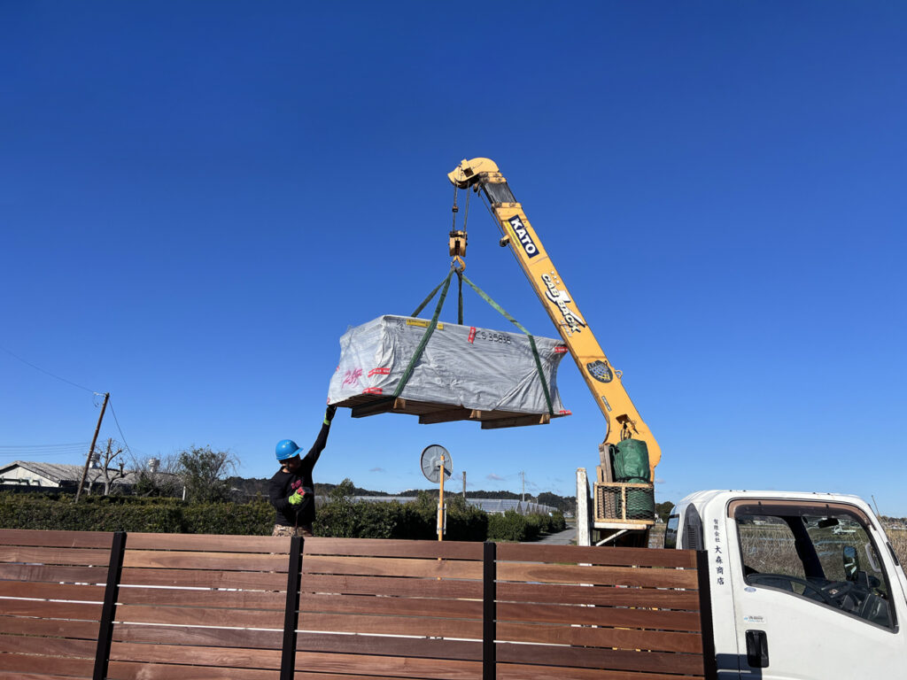 キット納品当日。ユニック車でキットが運ばれてきました。必要なものは、釘や金物含めすべてキットに入っているので、基本的に用意するのは工事の道具だけ。