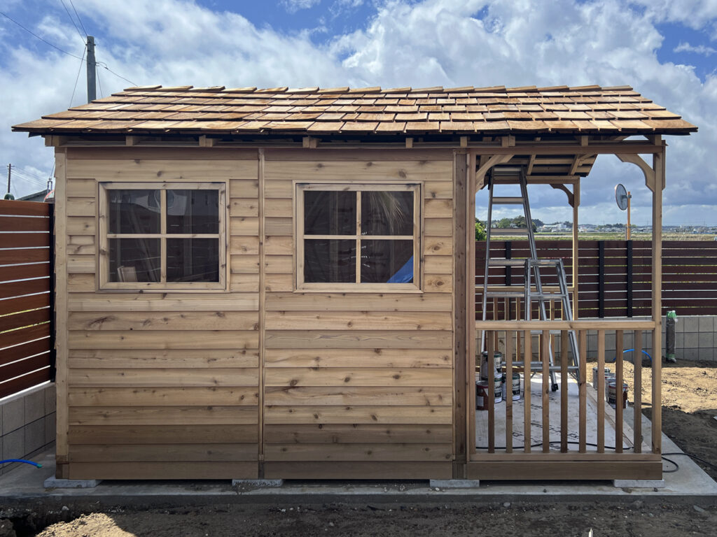 千葉県某所。こちらのお宅の広いお庭の片隅に、木製小屋「シダーシェッド」の設置をご依頼いただきました。