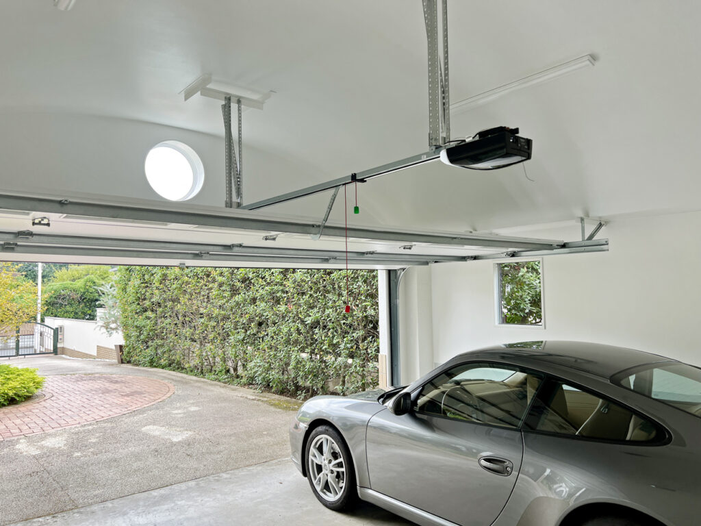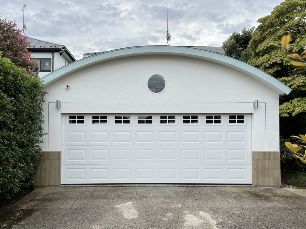 そして完成。レイズドパネルのガレージドアが建物のデザインと上手く調和して、もともとついていたような自然な仕上がりになりました。巻き上げシャッターも選択肢にあったそうなのですが、「こちらにして良かった」とオーナー様にも喜んで頂けました。
