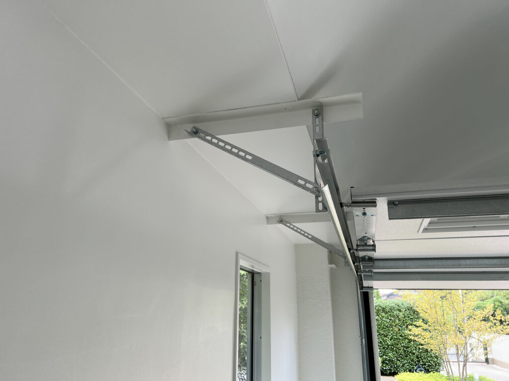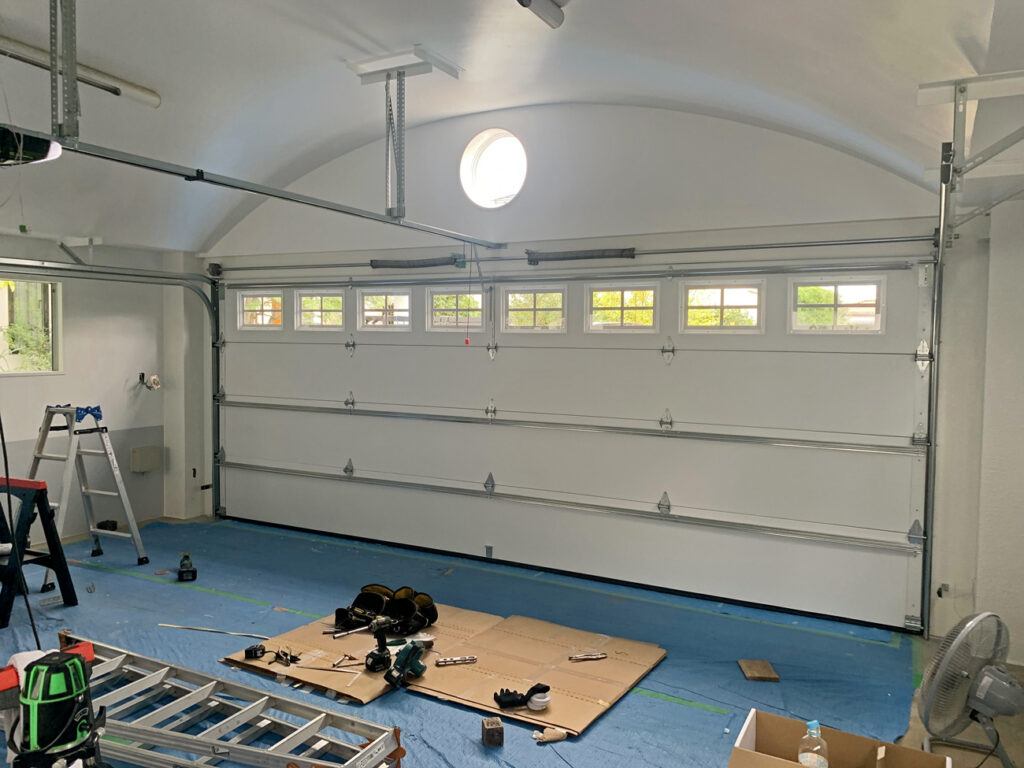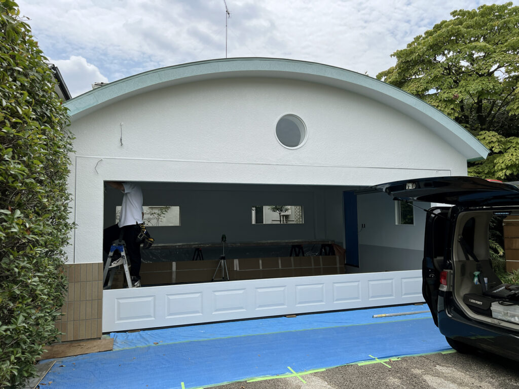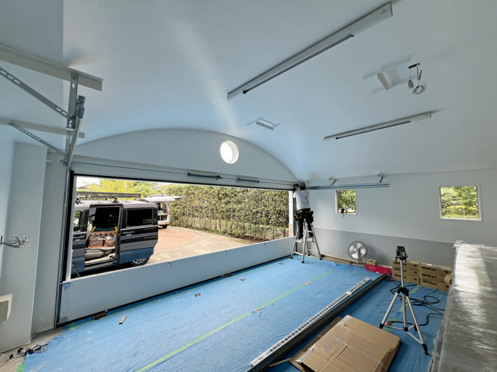 そして後日、屋外のタイル張りと屋内の塗装・電気配線工事が完了したとのことでガレージドアの取り付けを行いました。