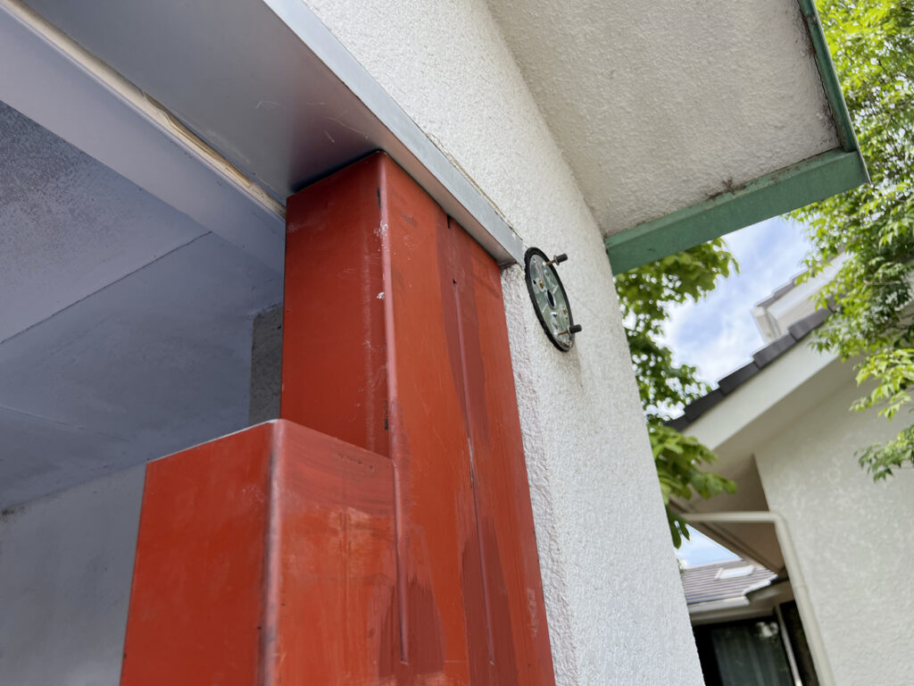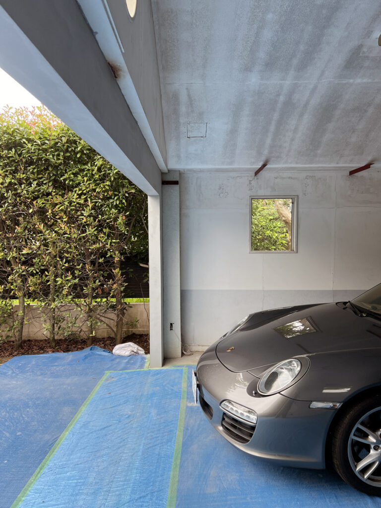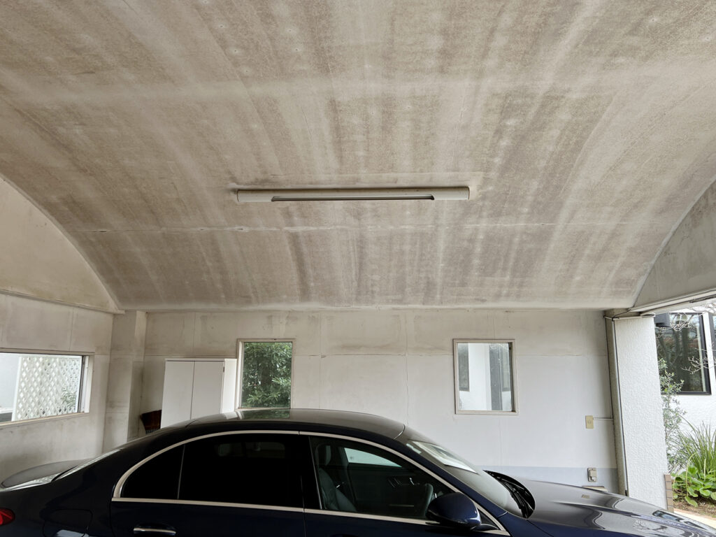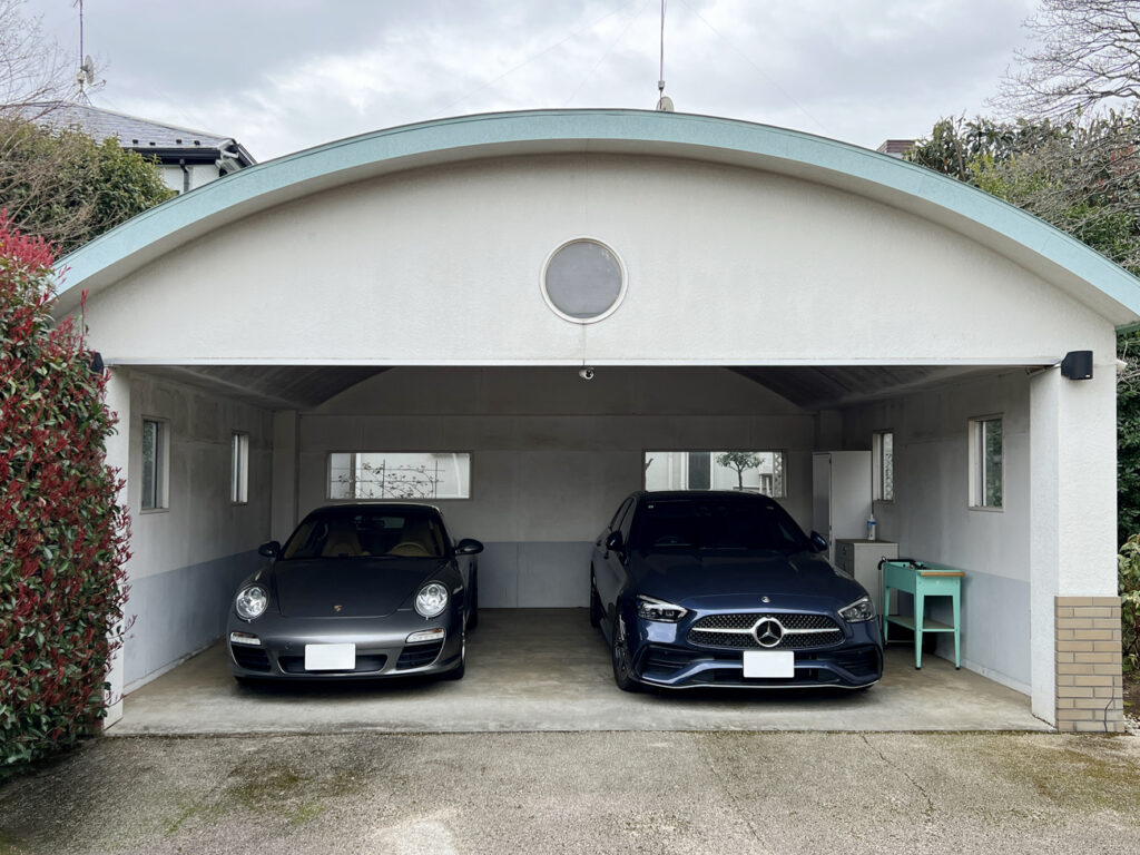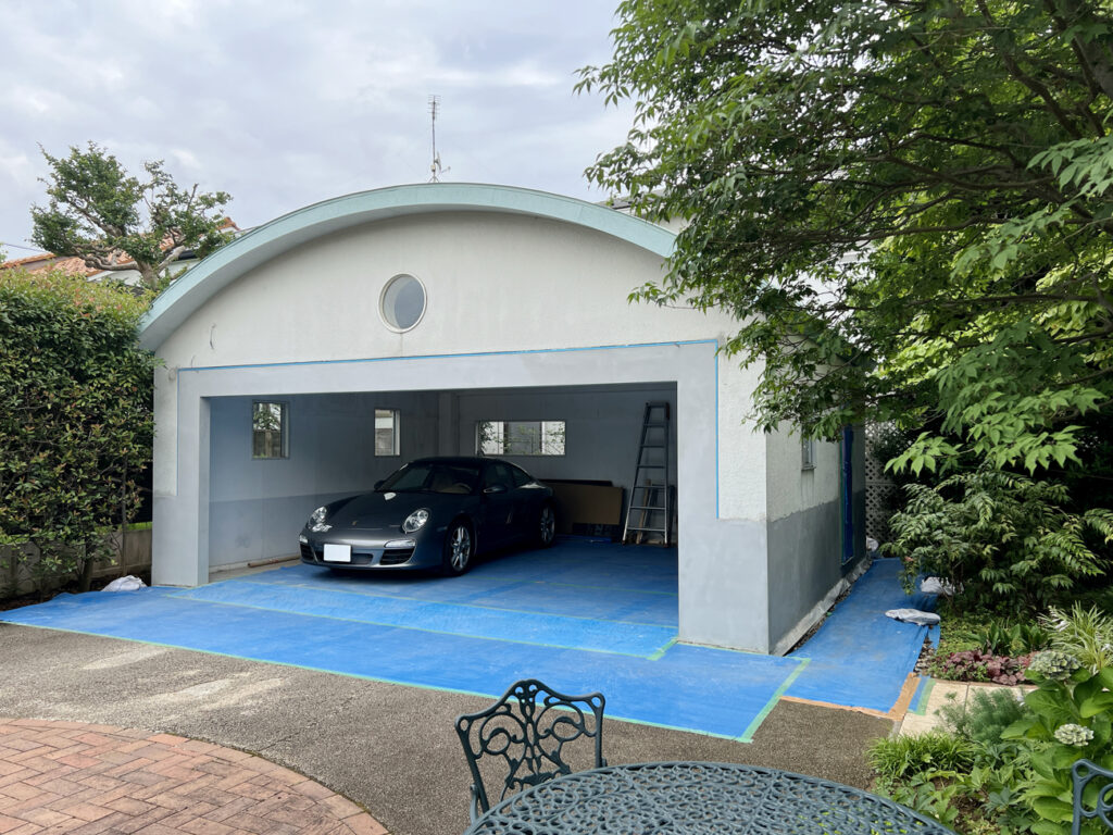 都内某所。既存の車庫の建築からおよそ25年経ち、だいぶ汚れや傷みがひどくなってきたので、綺麗にすると同時に、ガレージドアを新設したいというご依頼を頂きました。(弊社では鉄骨下地とガレージドアの工事のみ担当しました)