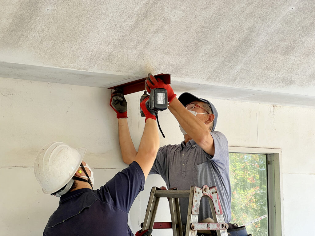 開口部の工事と併せて、ガレージドアレールの吊り下げ用の天井下地も必要箇所に増設します。またガレージドア以外の出入り口が無いので、窓を一箇所つぶして通用口ドアを取り付けるのですが、そのための開口も作製します。