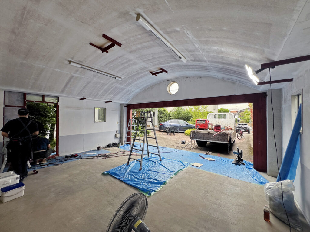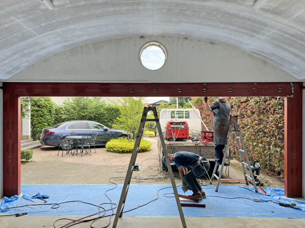 まずはBEFOREの状態。アーチ状の屋根が印象的な鉄骨造の車庫です。こちらにガレージドアを取り付けるのですが、元の状態だと開口が広すぎてガレージドアが取り付けられないので、鉄骨を増設し開口を狭めます。