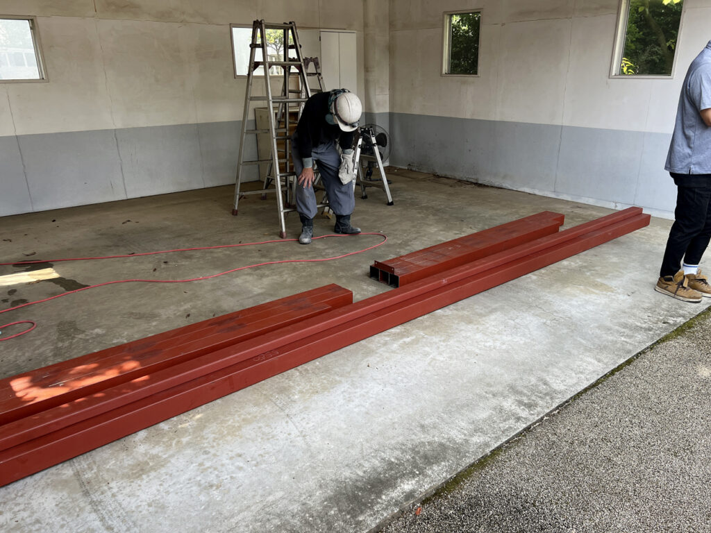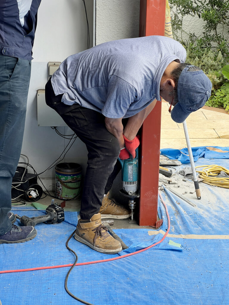 鉄骨を仮置きして位置を決めたら、コンクリートの土間にケミカルアンカーで固定します。