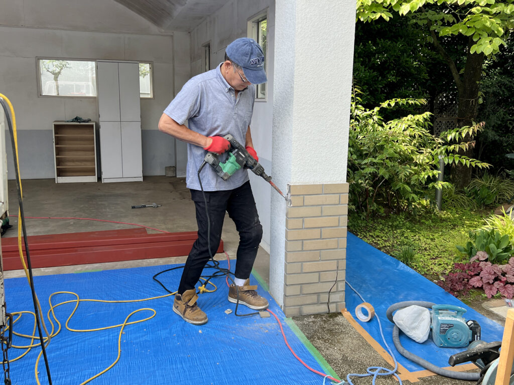 今回は外装のタイルも張替えなのですが、取り急ぎ、鉄骨を増設するにあたって必要な箇所のみ削ります。