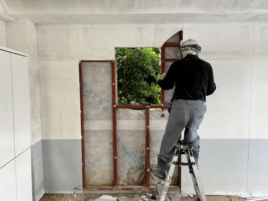 鉄骨下地の工事当日。既存の開口寸法に合わせ、予め加工された鉄骨が納品されます。