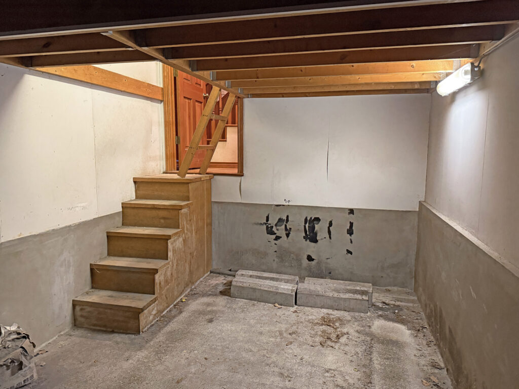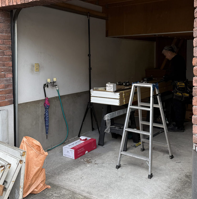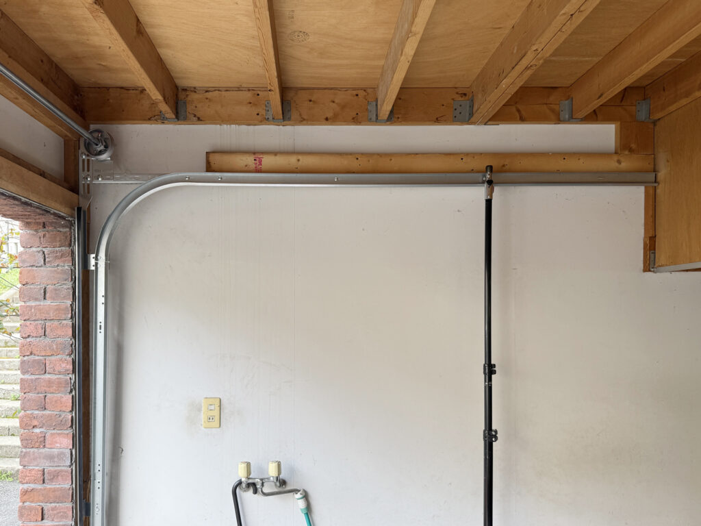 工事開始。まずは既存のドアの撤去をして、真新しいガレージドアのレールを取り付けていきます。