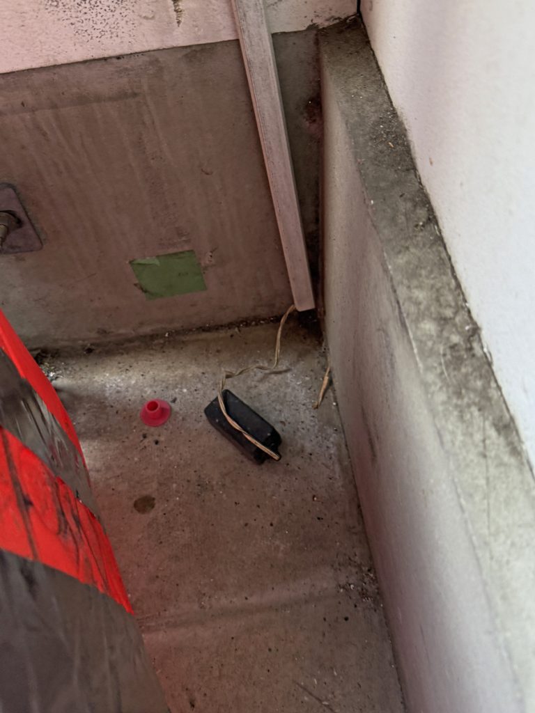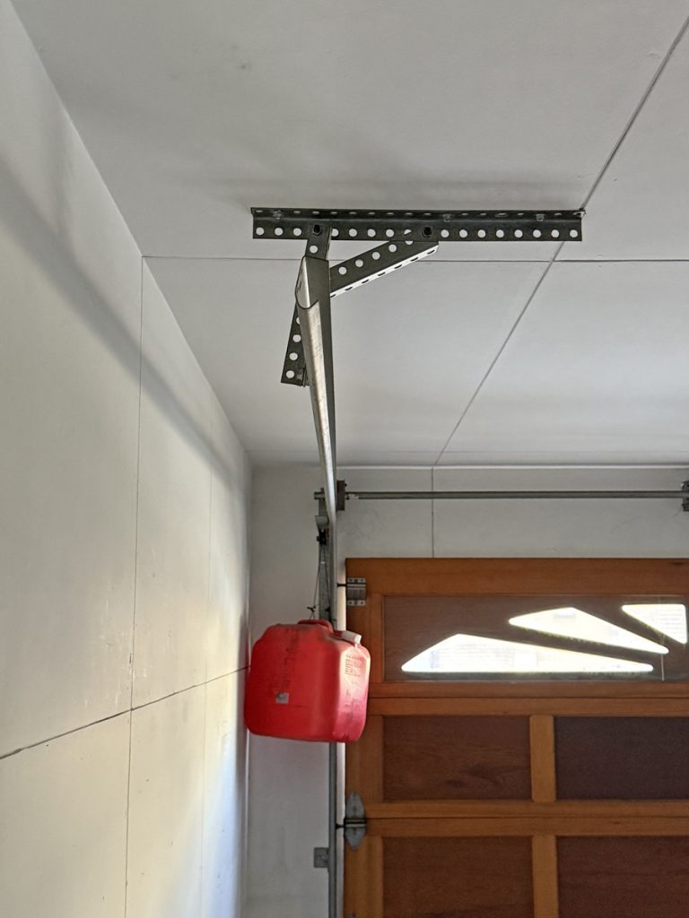 ポリタンクを吊るしたガレージドアは初めて見たので、思わず「なるほど。こんな方法があるのか」と感心してしまいました。ただこれでもかなり開閉が重く、また電動オープナーでも開閉できない状態でしたので、スプリング・ワイヤー・ローラーの消耗品および電動オープナーの交換で承りました。
