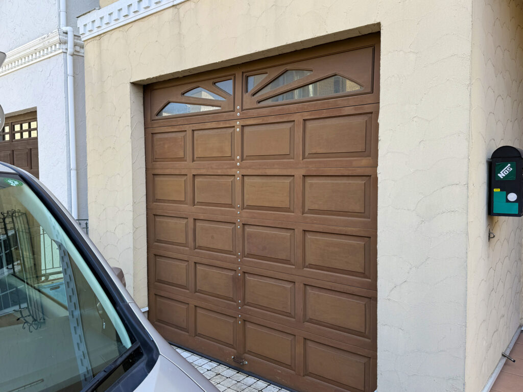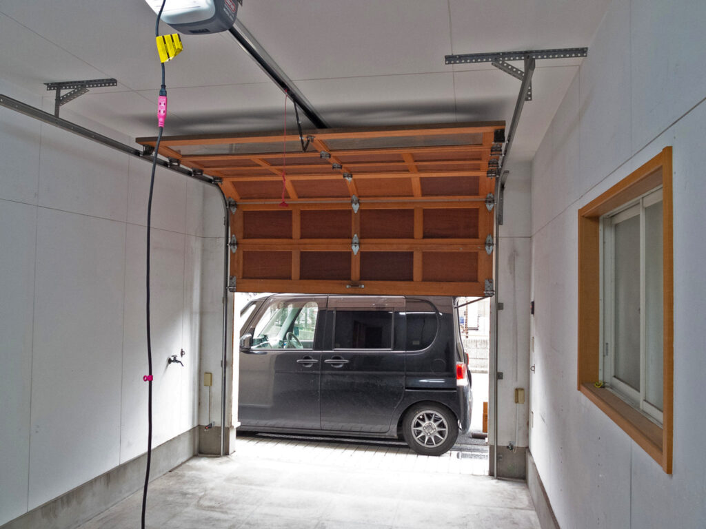 施工後の写真がこちらです。レールの歪みも修正し、スプリングとワイヤー、そしてローラーも新品に交換したのでとても静かに開閉します。お客様はこの物件をご購入されてから一度も電動でガレージドアが開閉するのを見たことがないとの事でしたのでお喜びいただけたのではないでしょうか。これからも末永くご使用していただきたいです。