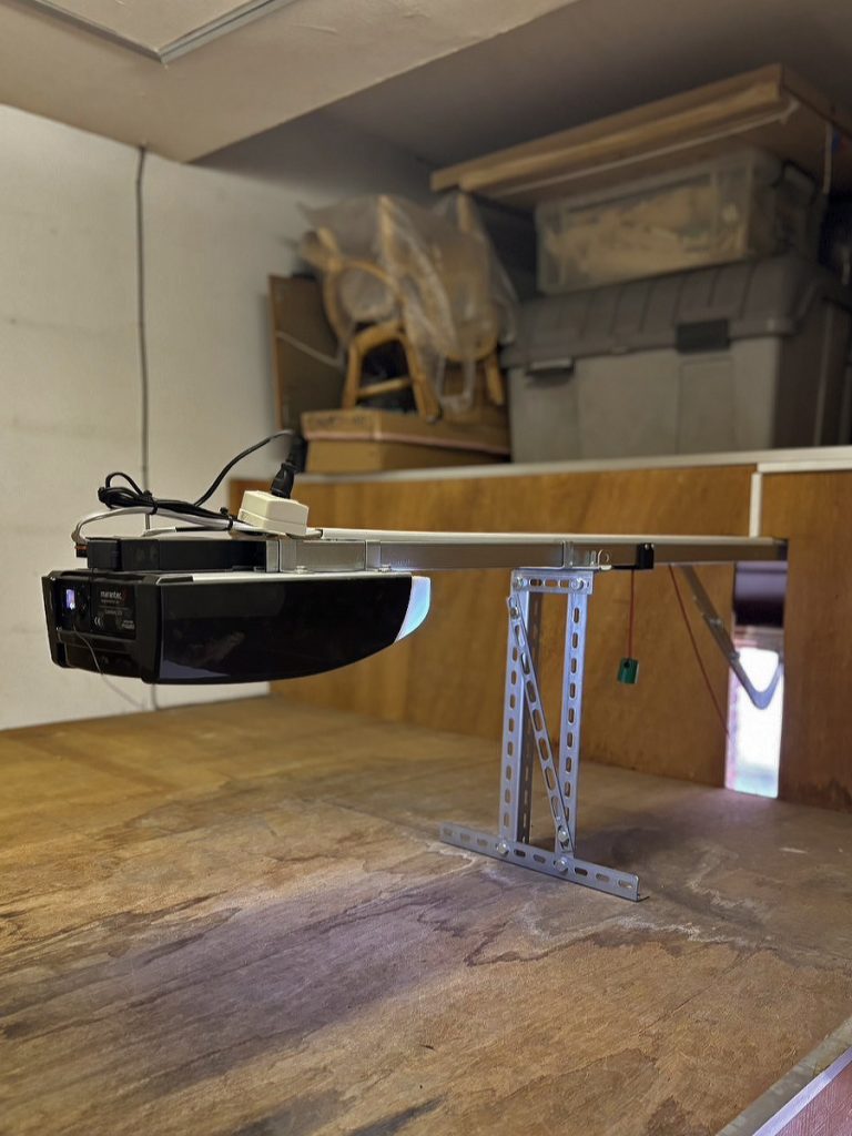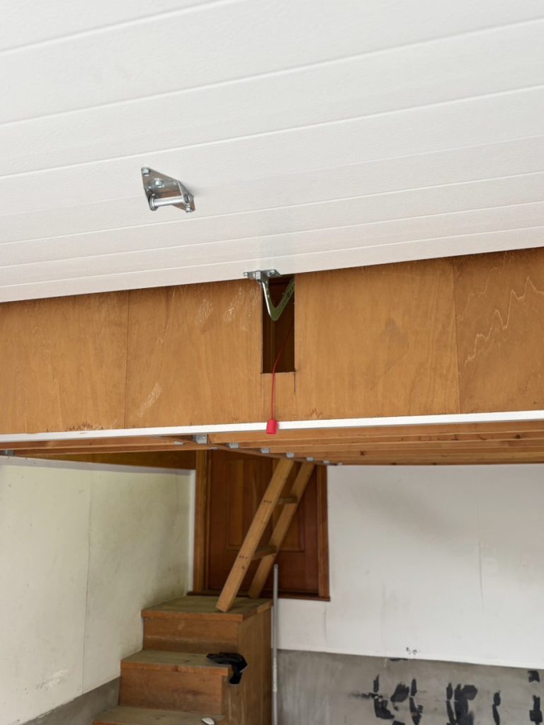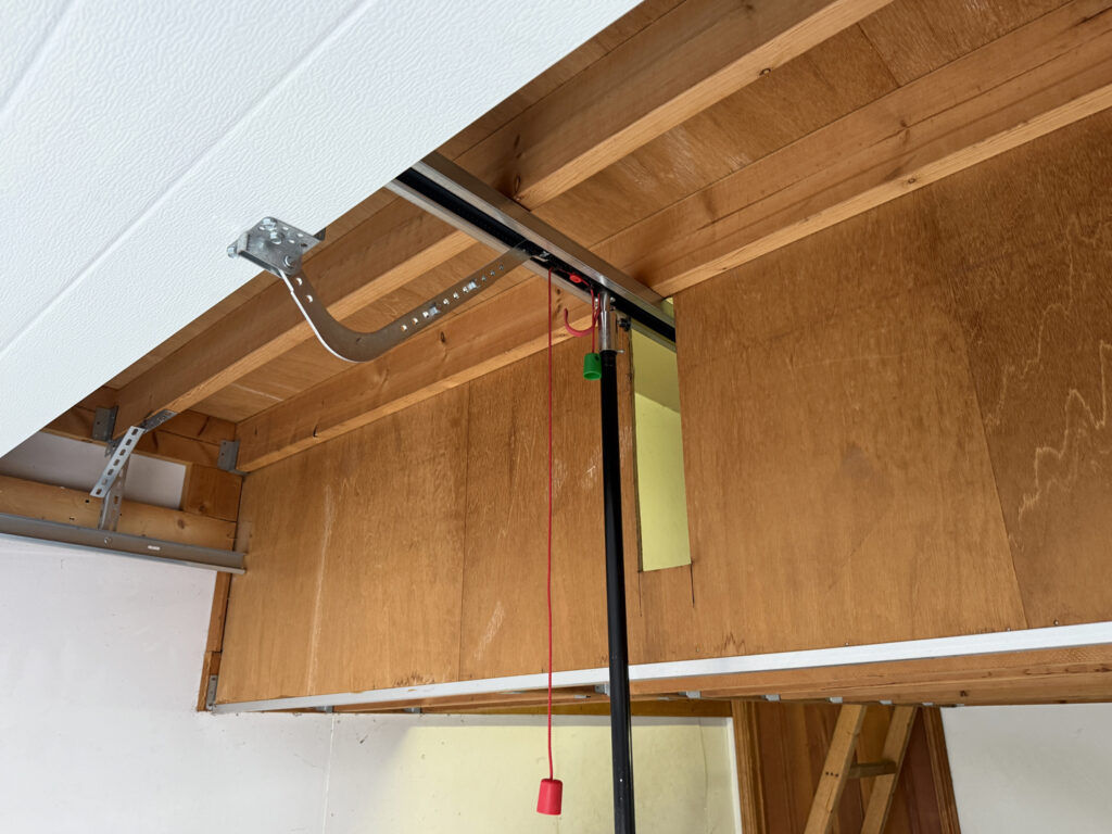 ただこちらの物件はガレージの奥にロフトがあり、電動オープナーを取り付けるのに干渉してしまうため、ロフトの壁板にオープナーレールが通るだけの穴を開け、その先のロフト上に電動オープナーを設置するという少し特殊な工事になりました。
