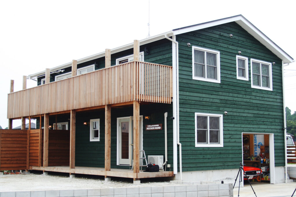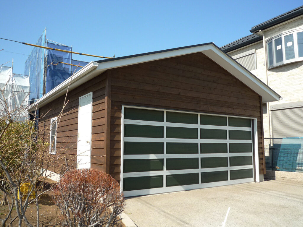 グリーンの外壁に白の建具が映える、落ち着きのある2台用ガレージ。