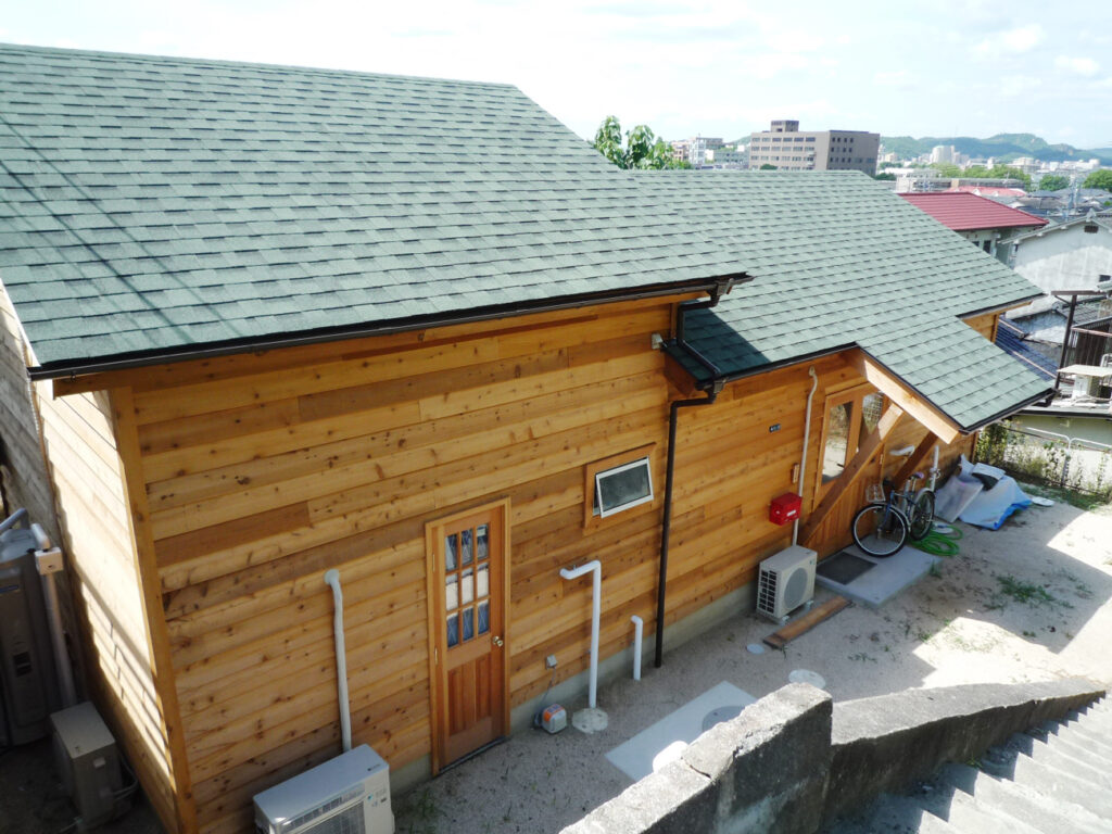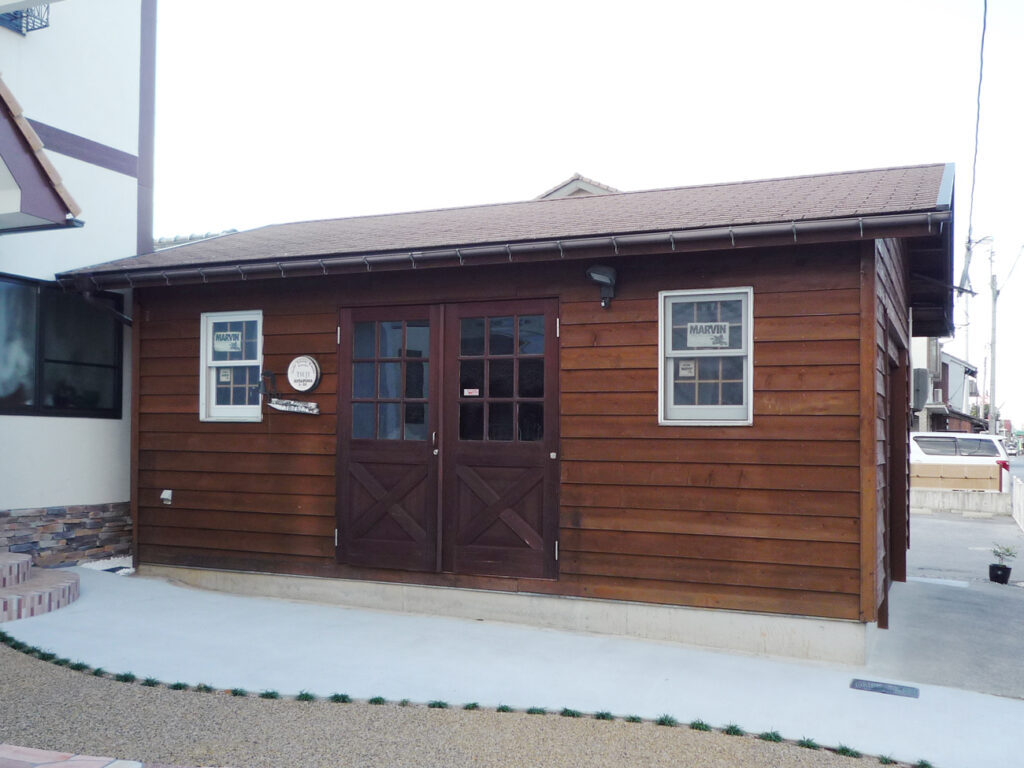 外はシックに、中は木の温もりを。森のシダーガレージの苔玉ショップ