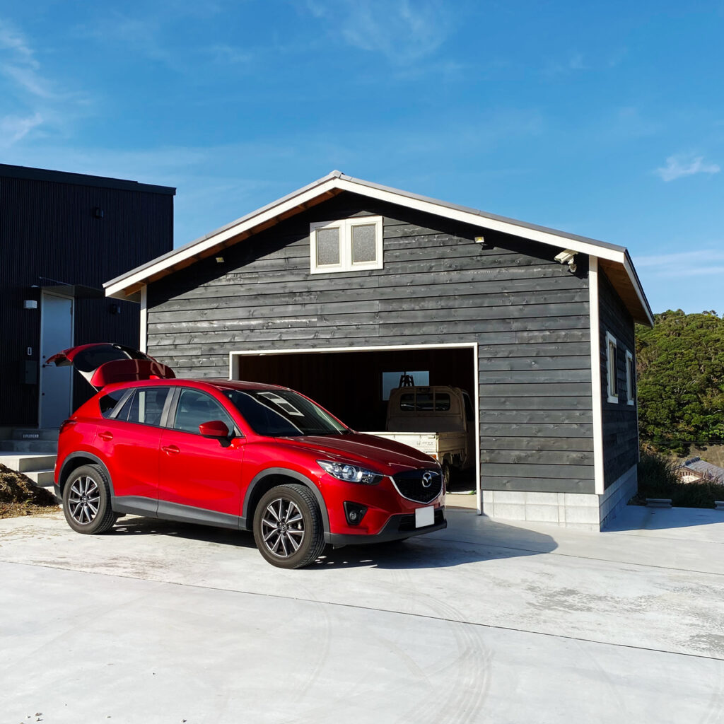 リフト設置を前提に高さを+300mm。ゆとりあるシダーガレージ。