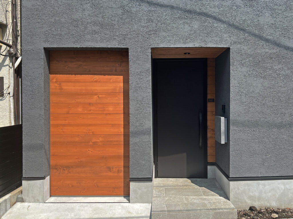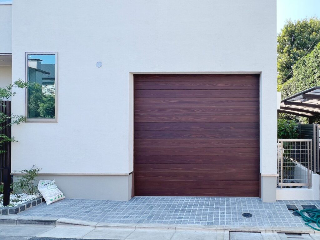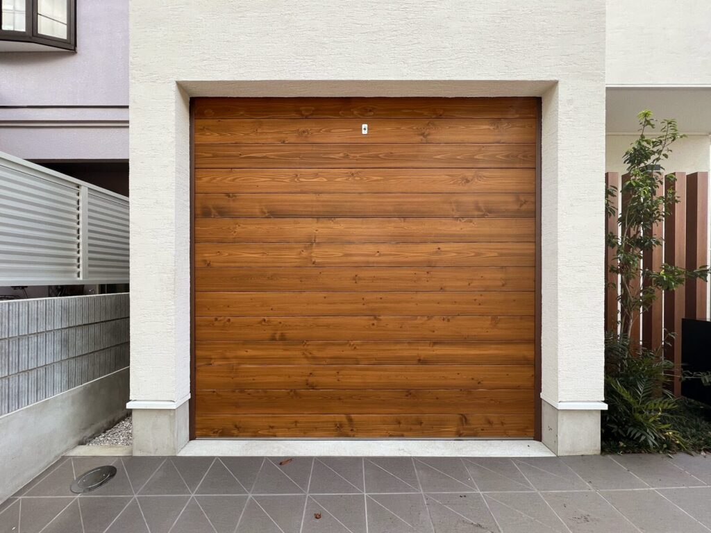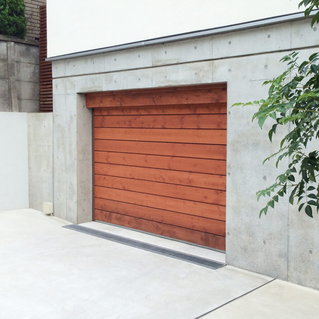 袖壁にピッタリとレールを収めた、東京産杉の木目ガレージドア