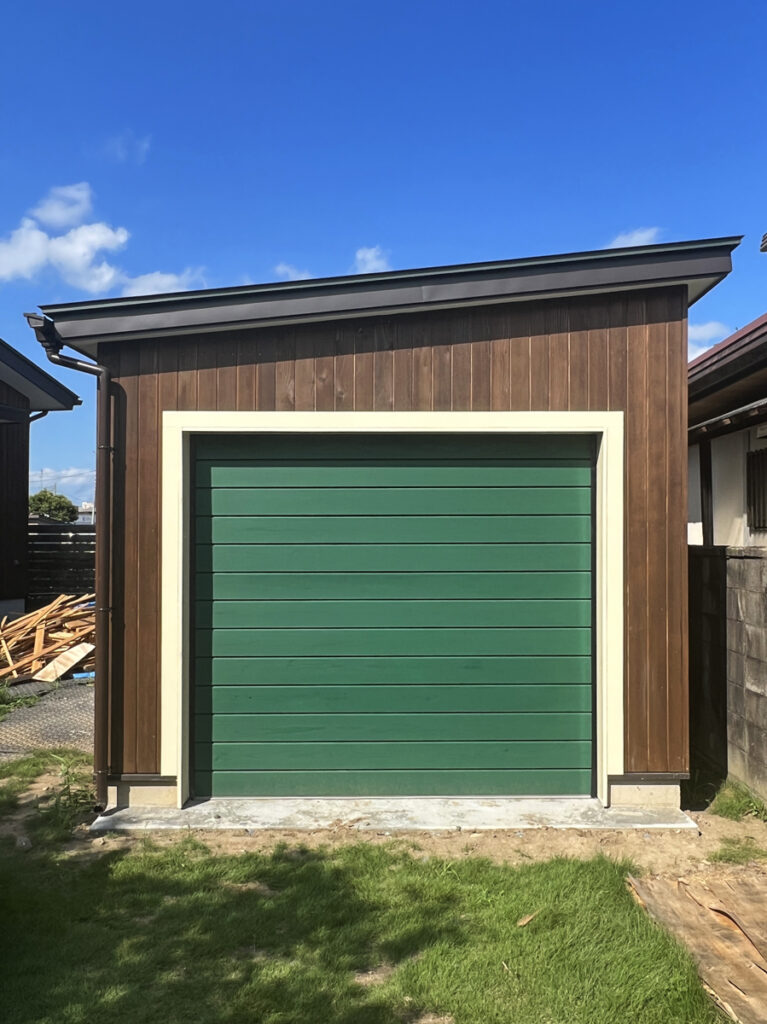 新緑のようなグリーンと木の温もりとが調和するガレージ