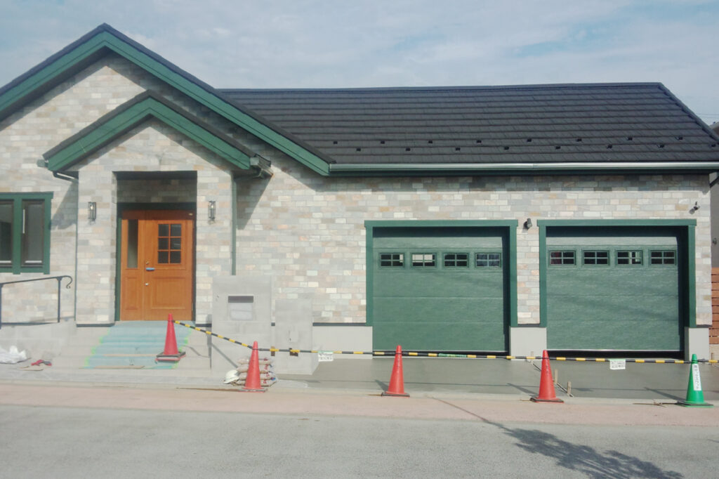 オーナー自作のガレージに設置。黒の外装に白のレイズドパネルドアが映える。