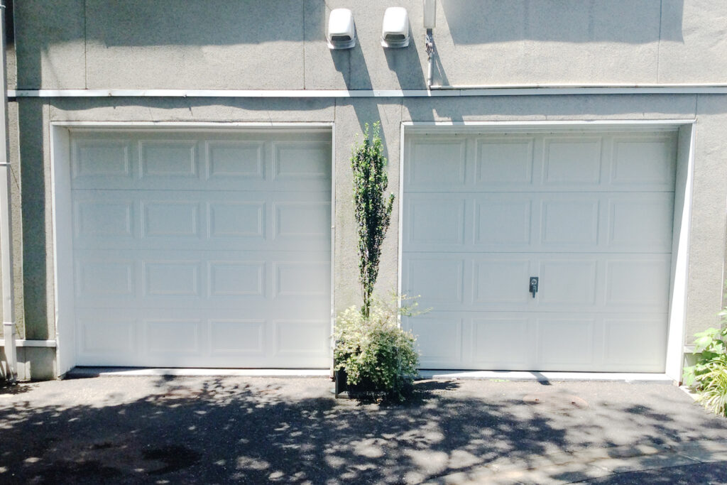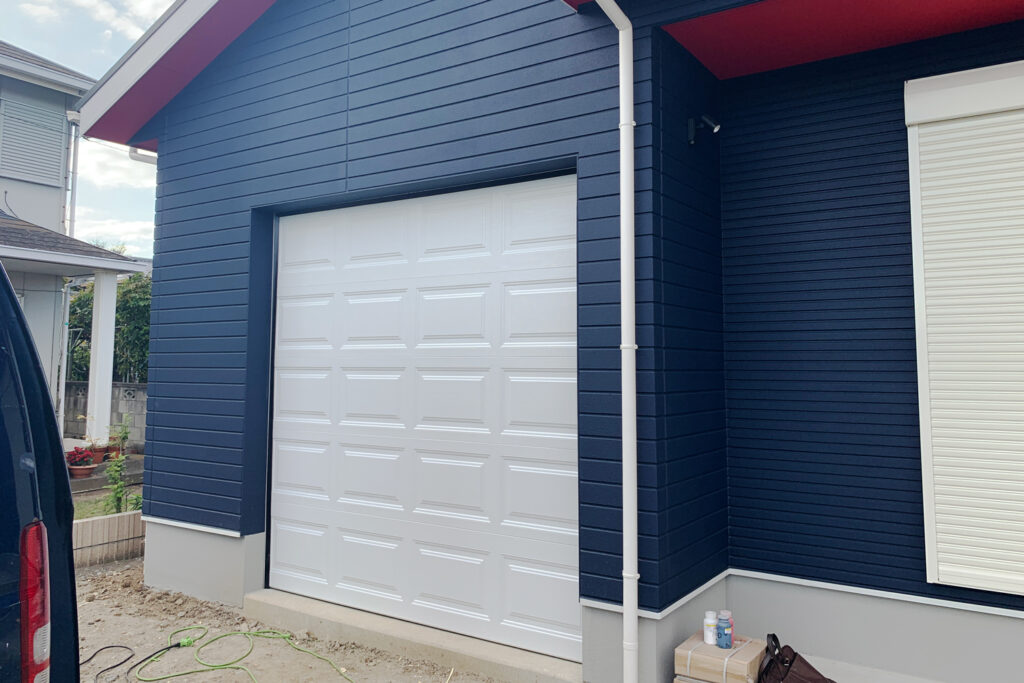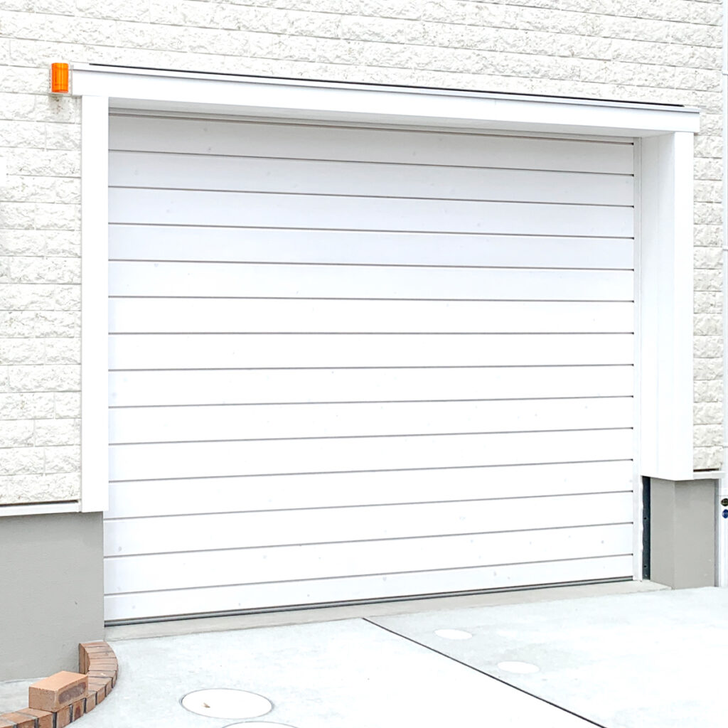 外観に合わせた特注ホワイト。内装まで爽やかに仕上がったガレージドア