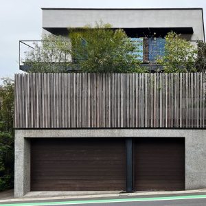 コンクリートと木が調和する、モダンな邸宅。防火仕様を備えたガレージドア。