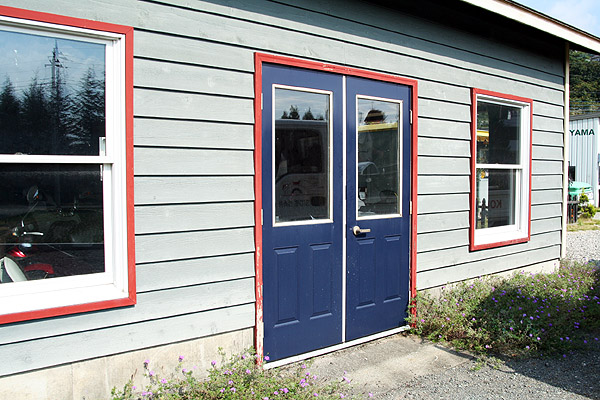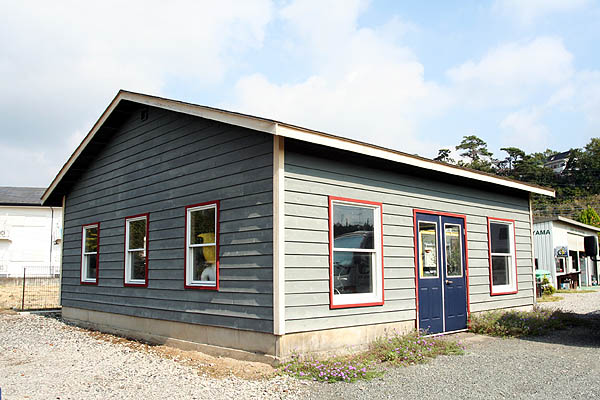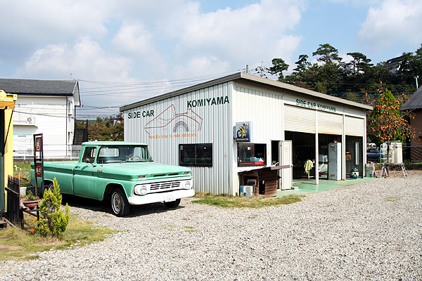 グレーの外壁に赤いドアが映える製作工房。サイドカー販売の拠点ガレージ