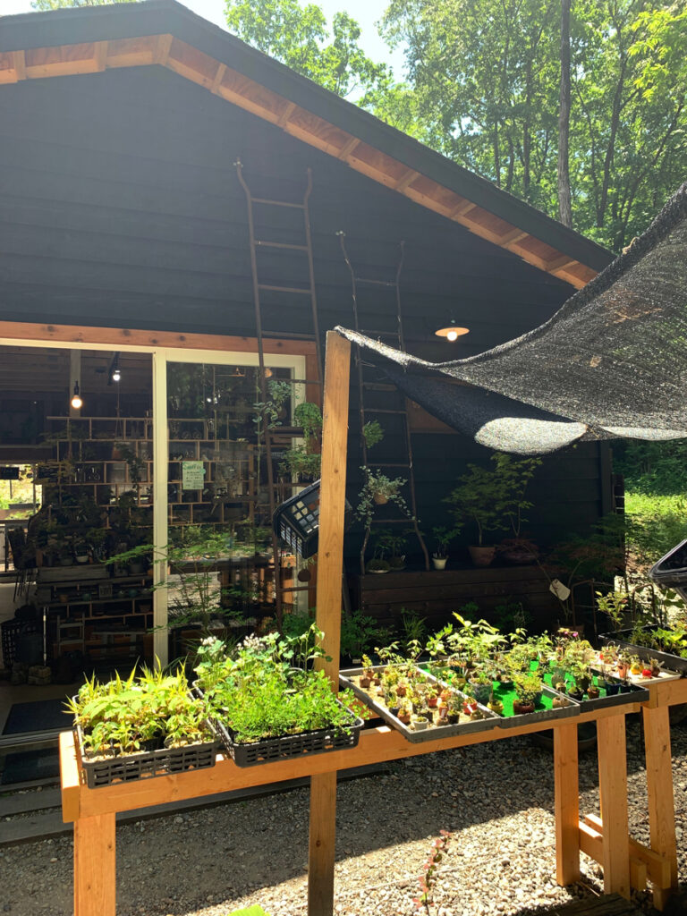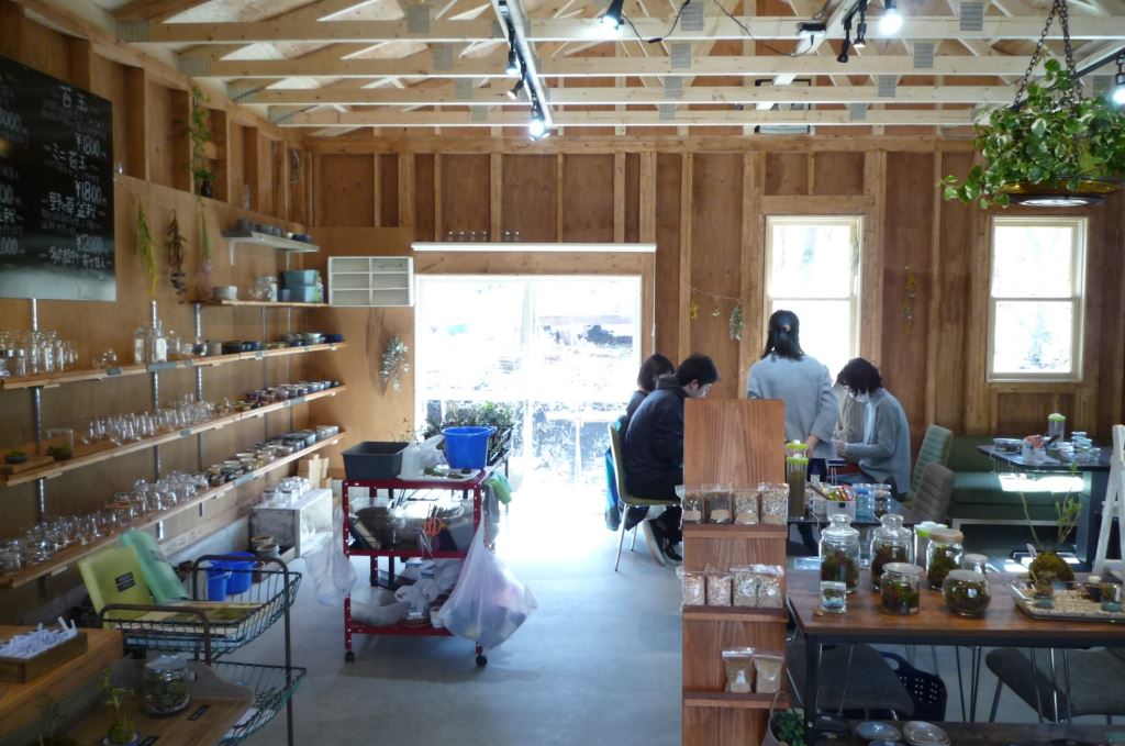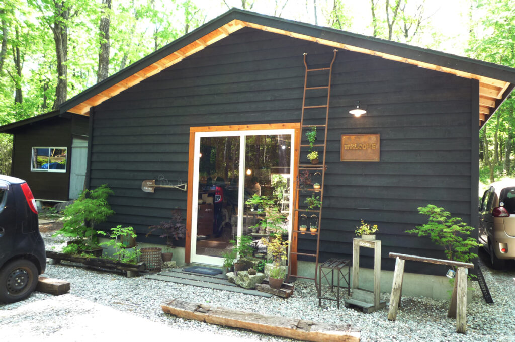 外はシックに、中は木の温もりを。森のシダーガレージの苔玉ショップ